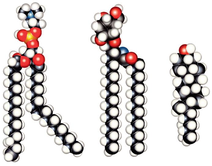 • Fig. 1.3 Models of the major classes of plasma membrane lipids, depicting the hydrophilic and hydrophobic regions of the molecules. The molecules are arranged as they exist in one leaflet of the bilayer. The opposing leaflet is not shown. One of the fatty acyl chains in the phospholipid molecule is unsaturated. The presence of this double bond produces a “kink” in the fatty acyl chain, which prevents tight packing of membrane lipids and increases membrane fluidity. (Modified from Hansen JT, Koeppen BM: Netter’s Atlas of Human Physiology. Teterboro, NJ: Icon Learning Systems; 2002.)