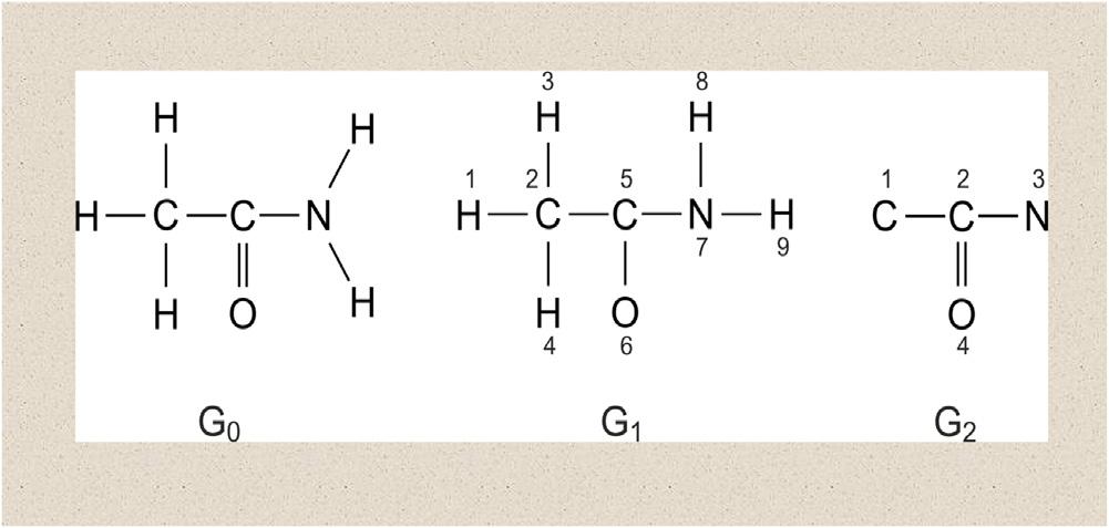 Figure1.2 Structuralformula(G0),labeledhydrogen-filledgraph(G1),andlabeled hydrogen-suppressedgraph(G2)ofacetamide.