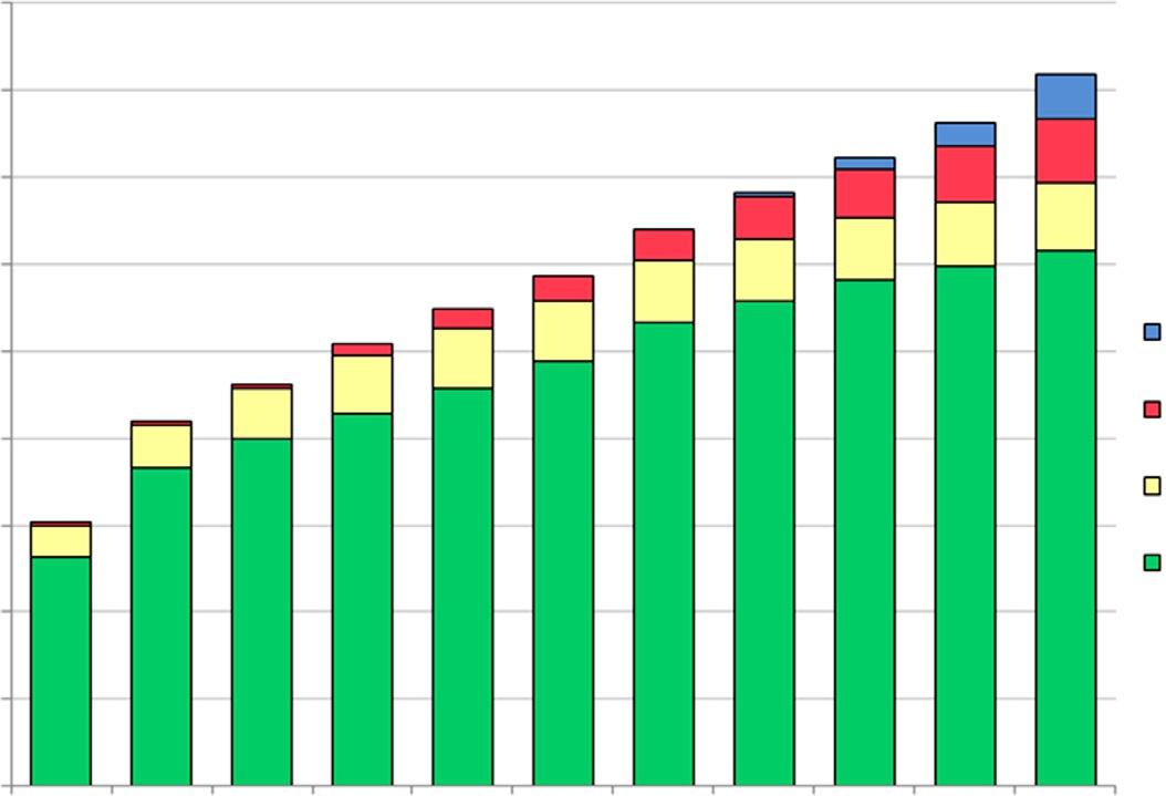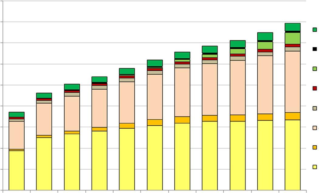 Globally,thetotalbiofuelsproductionhasincreasedovertime,withanestimatedethanolproductionat160billionliters(42.3billiongallons)in2019 andbiodieselproductionat41billionliters(11billiongallons)(OECD, 2010)(Figs.1.2and1.3).Thefeedstockcompositionintheglobalbiofuels productionhasvariedandchangedconsiderablyovertimeaswell.Accordingto OECD(2010) projections,ontheethanolmarket,coarsegrains (includingcorn)havereachedthepeakin2016,whileethanolproduction fromsugarcanewillincreasethroughout2019.Anincreasingtrendwasalso projectedforbiomass-basedethanolwith11billionliters(2.9billiongallons) onthemarketin2019.Onthebiodieselmarket,vegetableoilsconstitutethe mainfeedstockthatisexpectedtoincreaseupto30.7billionliters(8.1billiongallons)by2019(OECD,2010).Alsojatrophaandothernonagriculturalfeedstocks(animalfats)makeasmallershareinthebiodiesel 3