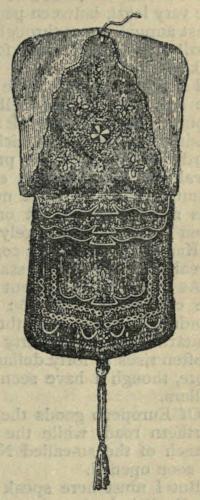 The chief articles of native industry, besides cloth, which have a wide market, are principally sandals. The sandals are made with great neatness, and, like the cloth, are exported to an immense distance; but being a cheap article (the very best, which are called “táka-sárakí,” fetching only two hundred kurdí), they bear of course no comparison in importance with the former. I estimate this branch at ten millions. It is very curious that the shoes made here by Arab shoemakers, of Sudán leather, and called “bélghʿa,” are exported in great quantities to North Africa. The “nesísa,” or twisted leather strap, is a celebrated article of Kanó manufacture, and “jebíras,” richly ornamented, as the woodcut on page 303 shows, are made by Arab workmen.