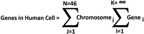 Simplisticallyspeaking,itisaheavy-duty filecabinetwithalock,tostoreDNAgenes.Chromosomesalwaysremain inthenucleus,butproteinsaremadeatribosomes.Chromosomesareidenticalineverycell,whichcontainaperson’s genes(DNAdata).Achromosomecontainshundredstothousandsofgeneswhicharetightlywrappedaroundinside histones.DNA,offullyextended,itslengthwouldbe1.7mlong.UnwrappingalltheDNAsinallourcells,itwould equaltothedistancefromEarthtomoon6000times.Anormalhumancellcontains23 2pairsofchromosomes, foratotalof46(maleandfemale)chromosomes.FemaleshavetwoXchromosomesintheircells,whilemaleshave oneXandoneYchromosome.Wecanusethismathematicalformulain(Fig.1.1)tosymbolizethenumberofgenes ineverycell.