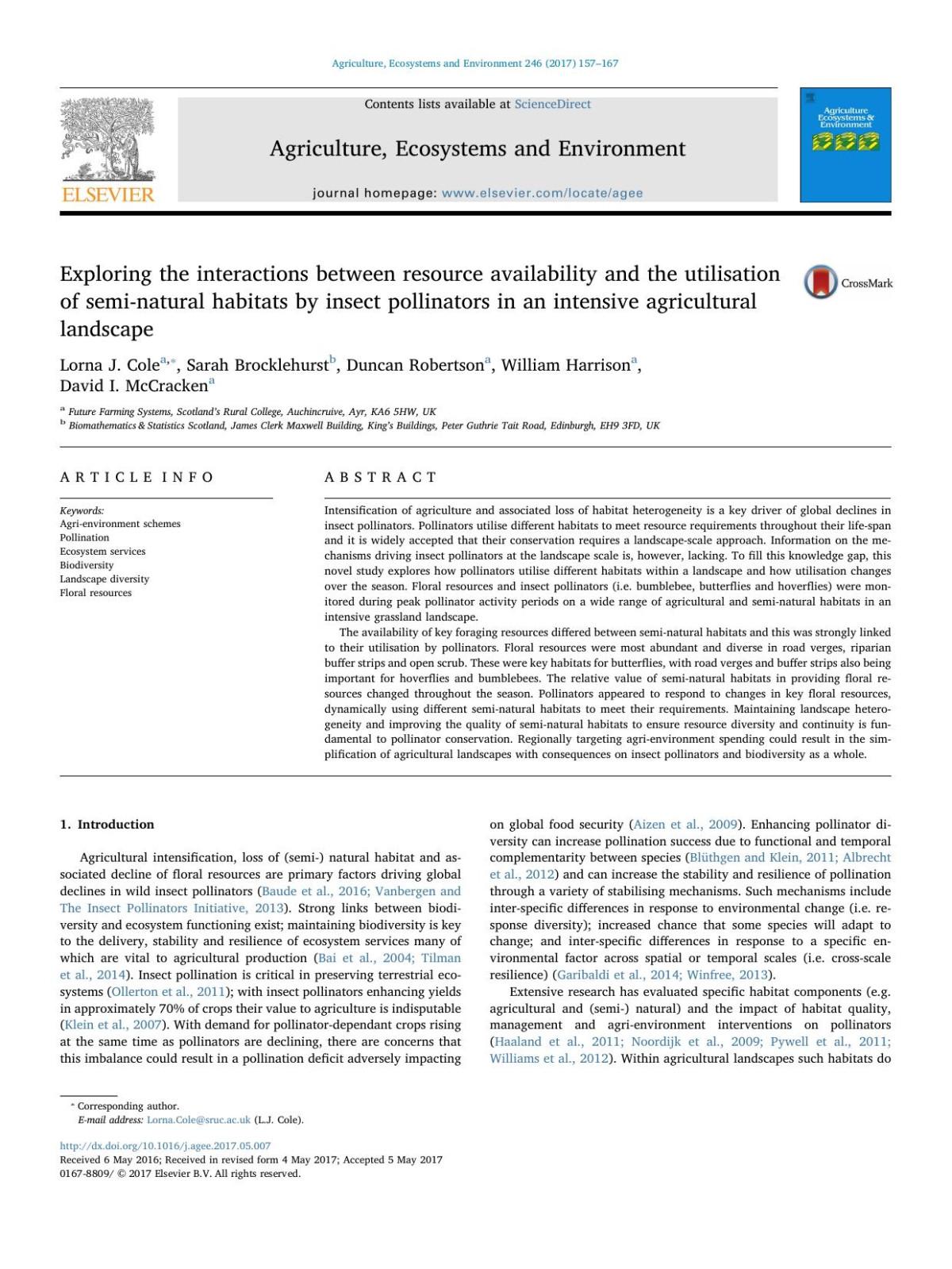 Exploring the interactions between resource availability and the utilisation of semi-natural habitats by insect pollinators in an intensive agricultural landscape Lorna J. Cole & Sarah Brocklehurst & Duncan Robertson & William Harrison & David I. Mccracken