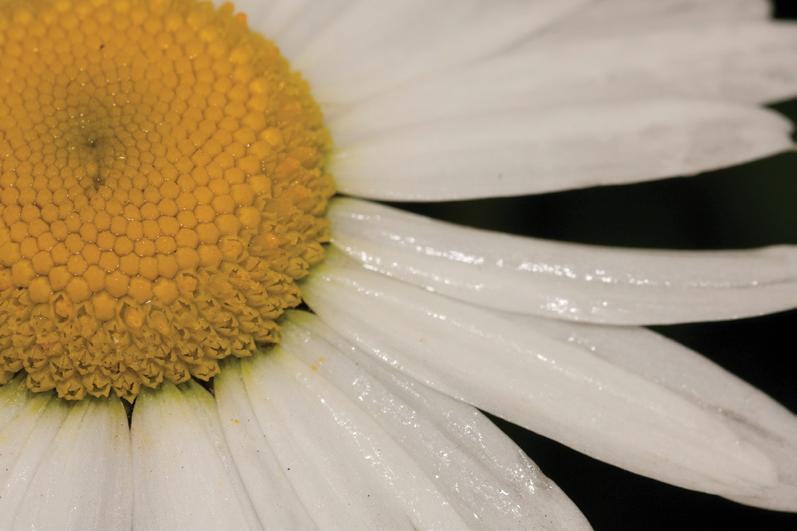 Plate 6: Close-up of portion of an oxeye daisy (Leucanthemum vulgare), a compound flower, showing the central disc flowers, surrounded by white ray flowers.