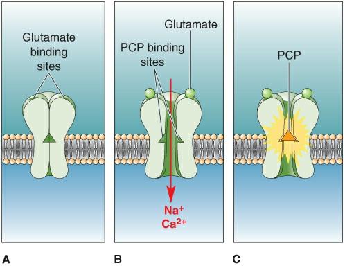 FIGURE 1-2. Glutamate: The drug phencyclidine (PCP) can block the N-methyl-d-aspartate (NMDA) receptor channel and is associated with hallucinations and paranoia in humans. Similarly, autoimmune reactions against the NMDA receptor (known as anti-NMDA receptor encephalitis) can produce a range of psychotic symptoms. (From Bear MF, Connors BW, Paradiso MA. Neuroscience: Exploring the Brain, 4th ed. Philadelphia, PA: Wolters Kluwer, 2015.)