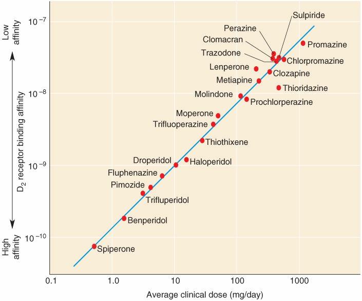 FIGURE 1-1. Dopamine: For dopamine receptor type 2 (D2) antagonist medications, the affinity with which the drug binds the D2 receptor predicts the drugs potency as an antipsychotic, supporting the dopamine hypothesis of schizophrenia. (From Bear MF, Connors BW, Paradiso MA. Neuroscience: Exploring the Brain, 4th ed. Philadelphia, PA: Wolters Kluwer, 2015.)