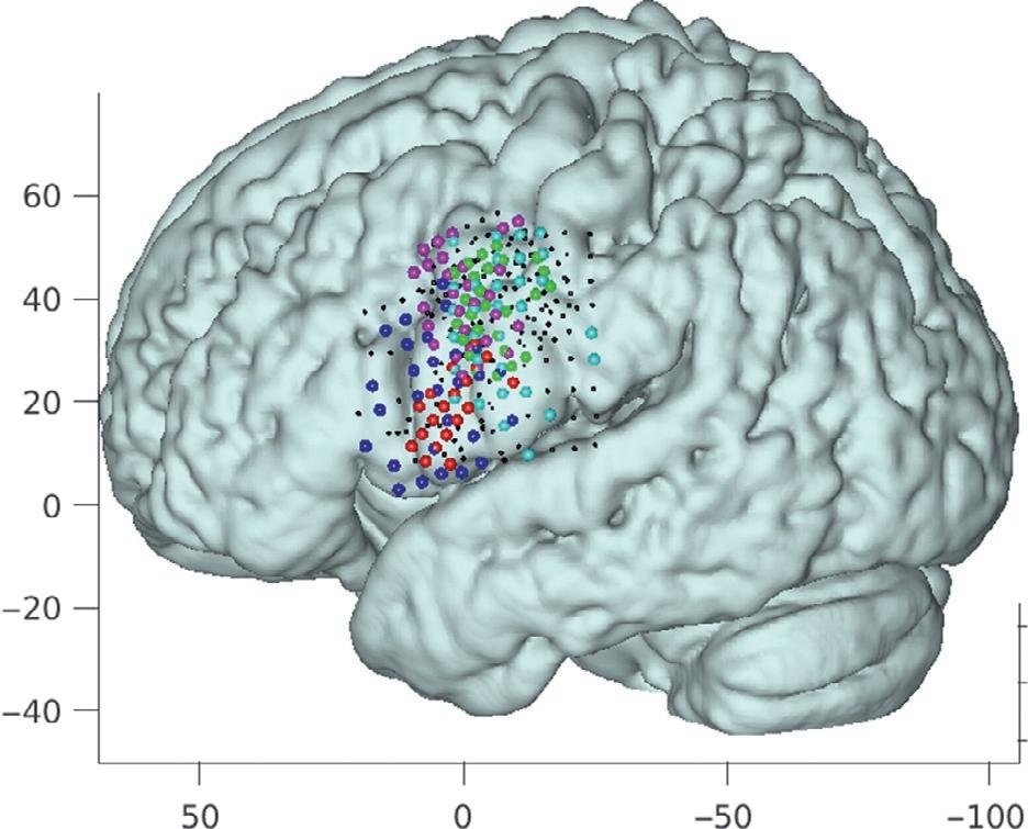 Fig.1.3. ElectrodesrecordinganHFBactivityresponseinthe sensorimotorfaceareaduringproductionofphonemes. Colors indicateeachoffiveparticipants(epilepsypatients). Black and coloreddots representelectrodes(allhigh-densityECoGgrids) inMNIspace(projectedontoanaverageof12normalbrains) (Ramseyetal.,2018).