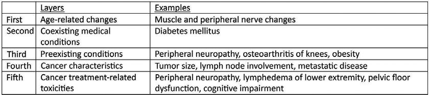 Treatmentsforbreastandgynecologiccancerscan havesignificantadverseeffectsontheindividual affectedbythesecancers.Onewaytothinkaboutthis isthrougha layeringofimpairments. Thereareseveral layersofpotentialissuesaffectingthepersonwith breastorgynecologiccancer:(1)aging-related changes;(2)presenceofcomorbidconditionssuchas diabetes,cardiacdisease,andconnectivetissuedisorders;(3)cancercharacteristicssuchastumorsizeand location,lymphnodeinvolvement,andpresenceof metastaticdisease;and(4)cancertreatment related injurytohealthytissuesfromsurgery,chemotherapy, radiationtherapy,antihormonaltherapies(Figs.1.1 and 1.2).