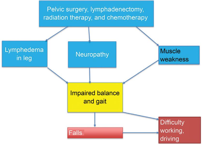 Anotherexampleofthecascadeofdisabilityasit appliestothepersonwithgynecologiccancerisinthe combinationofchemotherapy-inducedperipheral neuropathyassociatedwithlymphedemaoftheleg. Thiscancontributetoimpairedbalanceandan