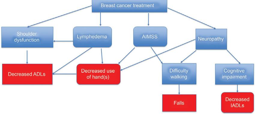 FIGURE1.3 Cascadeofdisabilityinbreastcancer. ADLs,Activitiesofdailyliving; AIMSS,aromataseinhibitor musculoskeletalsyndrome; IADLs,instrumentalactivitiesof dailyliving.Eachofthearrowsalsorepresentspointswhere rehabilitativeinterventionscanbeusedtoeitherprevent impairmentorminimizetheirfunctionalimpactontheindividualiftheyshoulddevelop.
