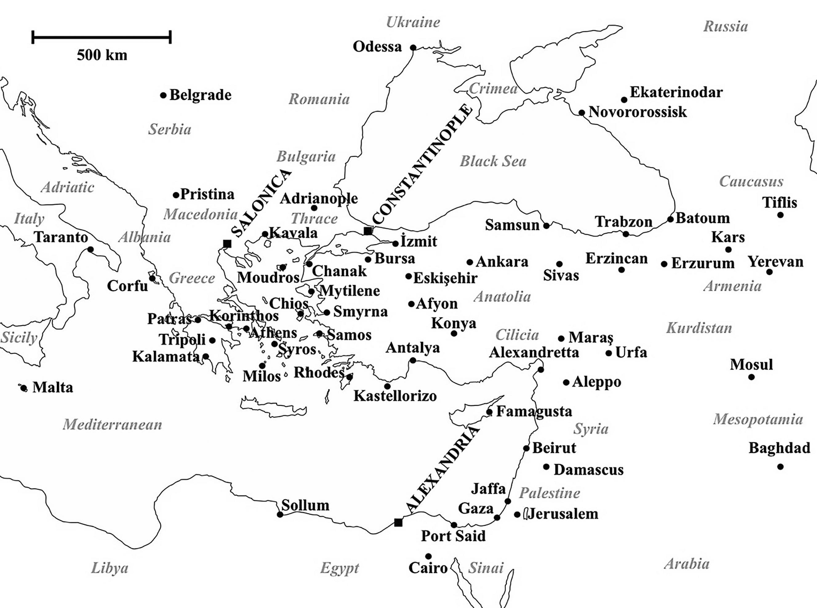 1 As this book deals primarily with British thoughts and actions in these cities, I have used the dominant Anglophone place names from the period (Constantinople for Istanbul; Salonica for Thessaloniki; Alexandria for al-ʾIskandariyya; Smyrna for İzmir; Batoum for Batumi). For less wellknown sites, modern Turkish and transliterated Greek and Arabic names are used for ease of location.