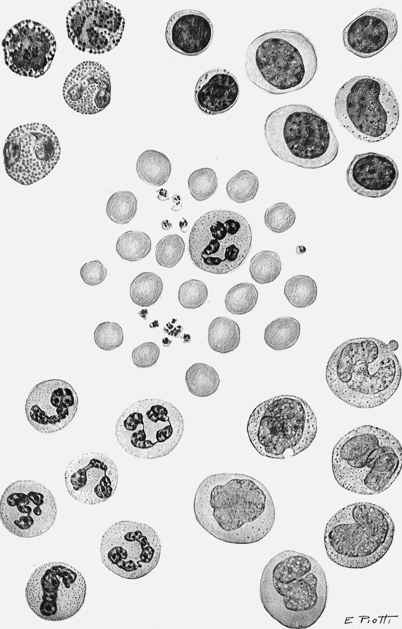 Fig. 1.4 The morphology of blood cells. 1, Normal red blood cell; 2, platelet; 3, neutrophil; 4, neutrophil, band form; 5a, eosinophil, two lobes; 5b, eosinophil, band form; 6a, basophil, band form; 6b, metamyelocyte, basophilic; 7, lymphocyte, small; 8, lymphocyte, large; 9, monocyte, mature; 10, monocyte, young. (From Daland, G. A. (1951). A color atlas of morphologic hematology. Cambridge, MA: Harvard University Press.)