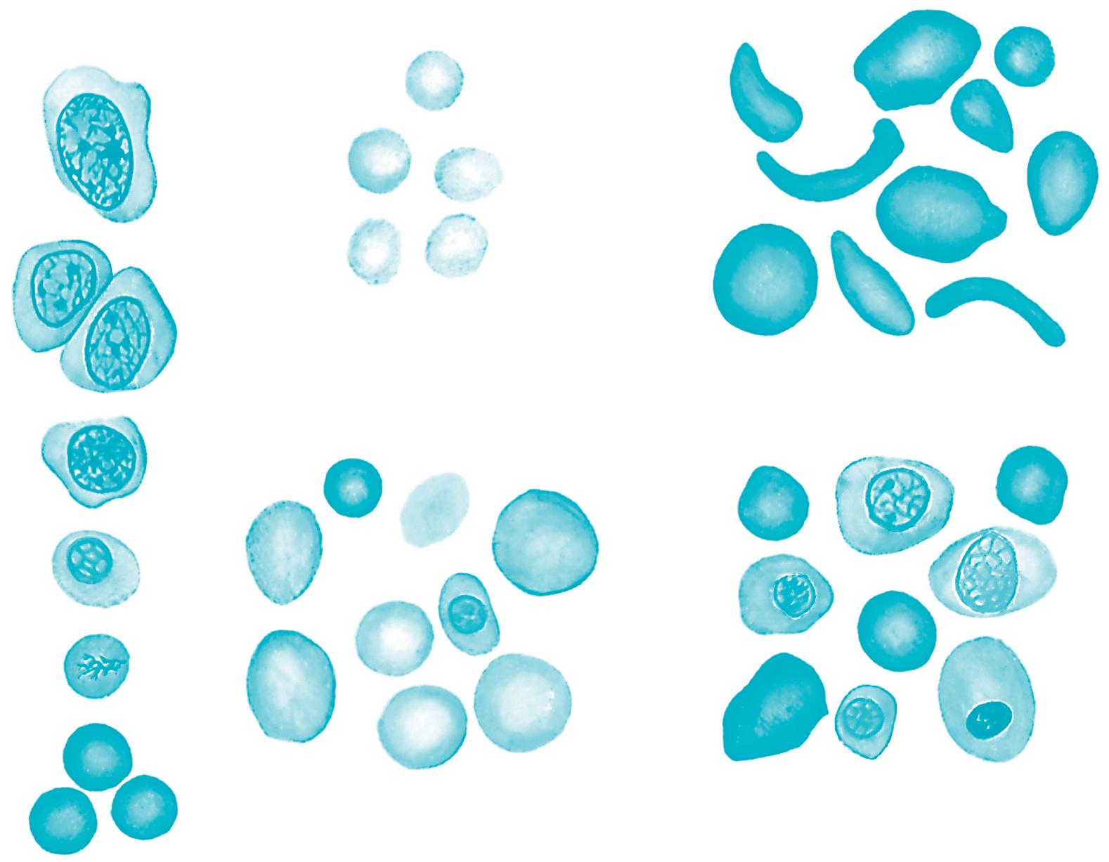 Changes in the polypeptide subunits of globin affect the affinity of hemoglobin for O2. For example, fetal hemoglobin has two γ chains instead of two β chains. This substitution increases its affinity for O2. Changes in the polypeptide subunits of globin may induce certain serious diseases, such as sickle cell anemia and erythroblastosis fetalis (Fig. 1.6). Sickle cell anemia is a disorder associated with the presence of hemoglobin S, which is an abnormal form of hemoglobin in the erythrocytes. Many of the erythrocytes in the bloodstream of patients with sickle cell anemia have a sicklelike shape (see Fig. 1.6). Consequently, many of the abnormal cells cannot pass through the capillaries and, therefore, cannot deliver adequate O2 and nutrients to the local tissues. Thalassemia is also a genetic disorder of the globin genes; α and β forms exist. In either case, the disorder leads ultimately to a microcytic (small cell), hypochromic (inadequate quantity of hemoglobin) anemia (see upper central panel of Fig. 1.6).