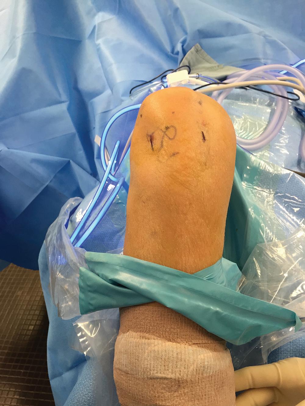 ■ The foot of the operative leg is rested on the anterior tibia of the contralateral leg.