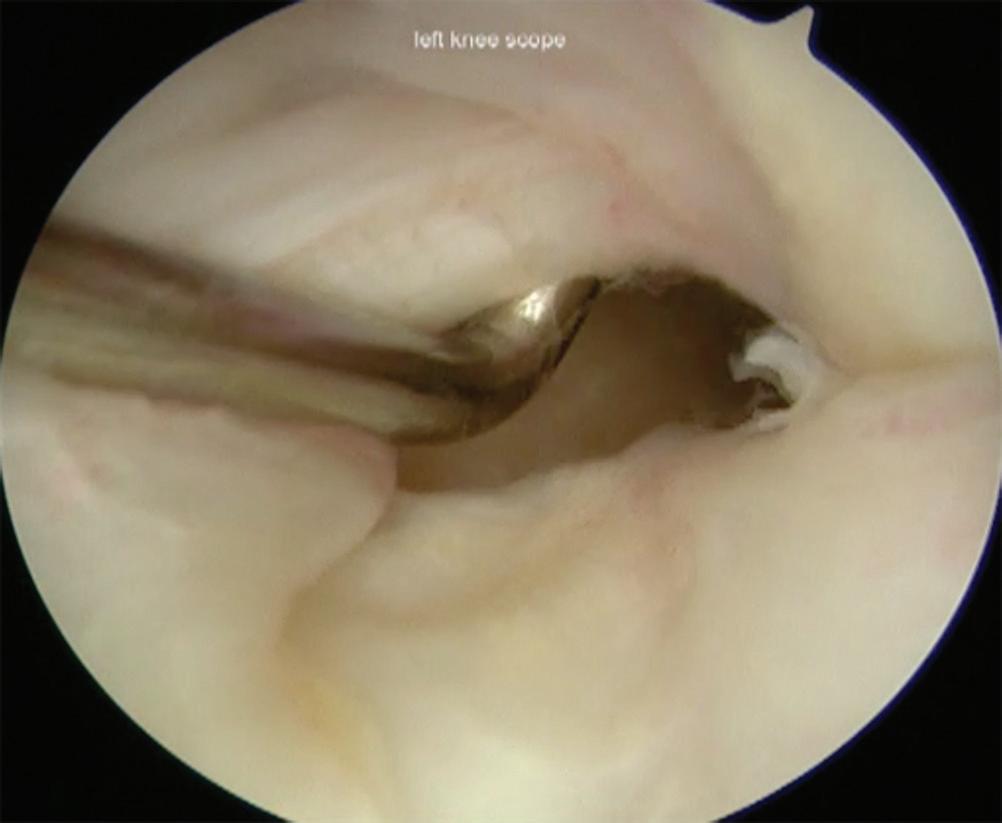 Figure 1-8 Arthroscopic photograph of the left knee shows assessment of the anterior cruciate ligament.