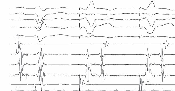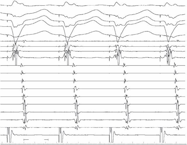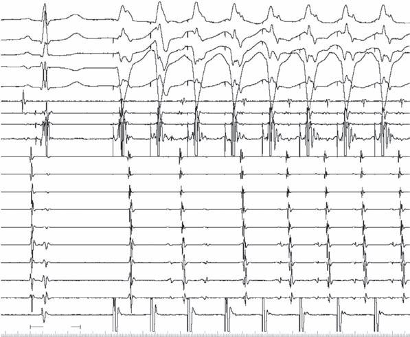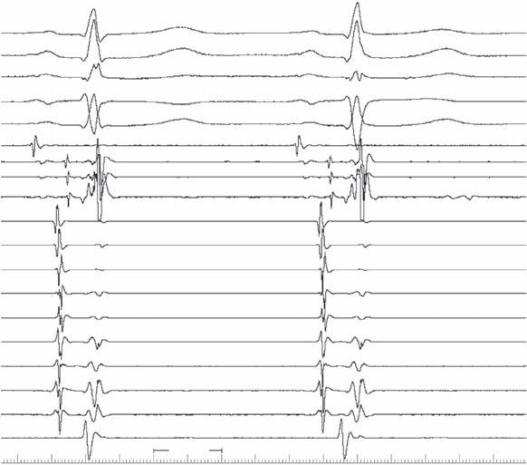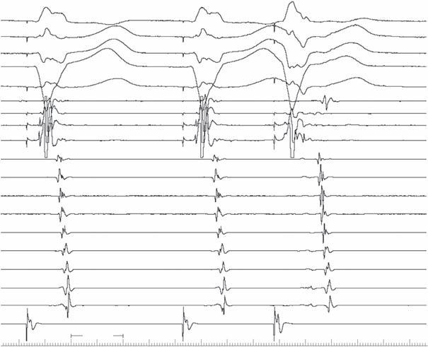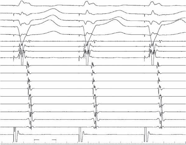 In Fig. 2-3, with ventricular pacing at 600 ms, retrograde conduction is present with a concentric activation pattern; a retrograde His potential (arrow) is seen between stimulus artifact and local ventricular electrogram.