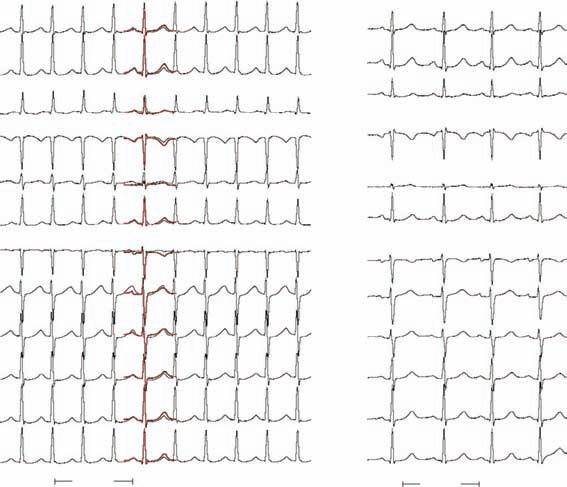 SVT was induced ((left); sinus rhythm is shown at right in Fig. 2-6. A superimposed sinus complex (red) overlaid on SVT shows no clear difference, implying that the P wave must be hidden within the QRS complex.