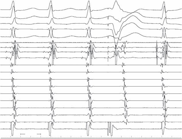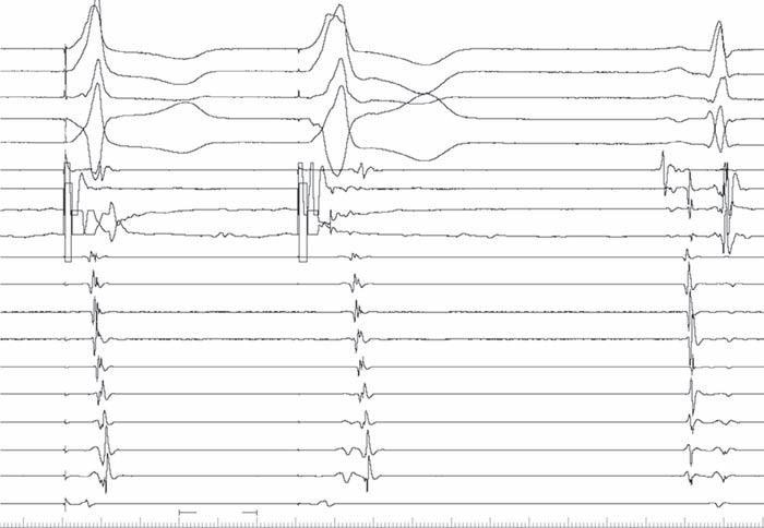 The left side of Fig. 1-3 shows a sinus rhythm complex as in the previous figure for reference, whereas the 2 complexes on the right are during pacing from the right ventricular apical region. Note that there is retrograde conduction to the atria, with the His bundle activated from distal to proximal as expected. Usually, the timing of the His potential is before the local ventricular electrogram in the His recoding, because conduction proceeds more rapidly up the RBB to the His than does muscle-to-muscle propagation from apex to base. Because there is RBBB in this case, the impulse cannot ascend the RBB as it normally would and instead must traverse the interventricular septum, enter the left bundle branch, and then activate the His retrogradely. These findings just confirm the His-Purkinje disease but give no further insight as to the cause of syncope.