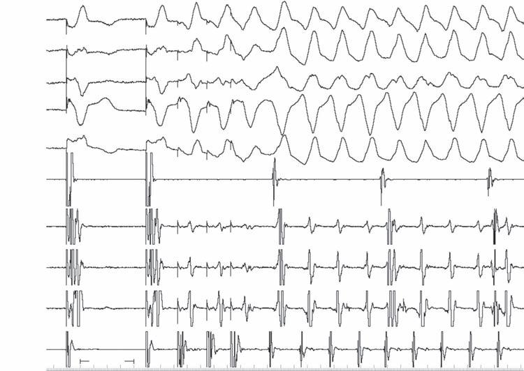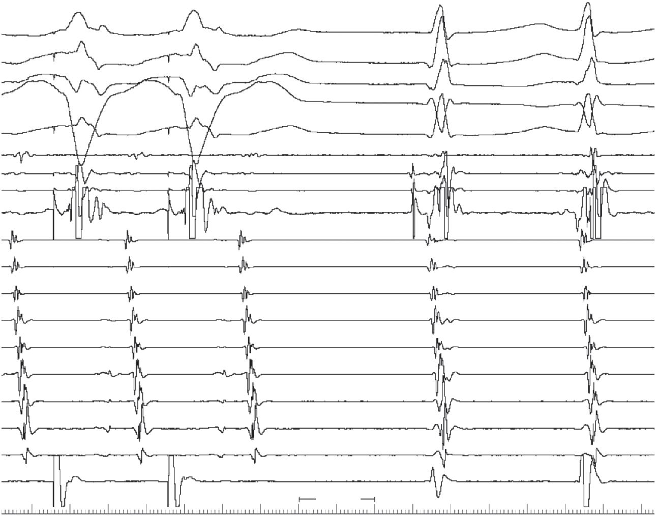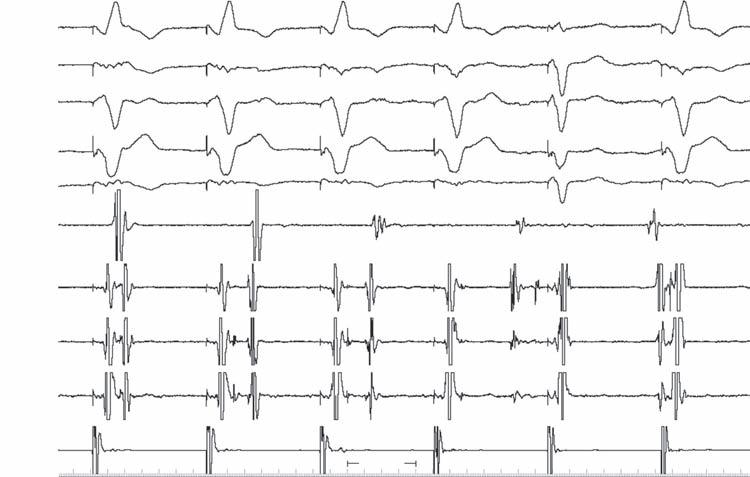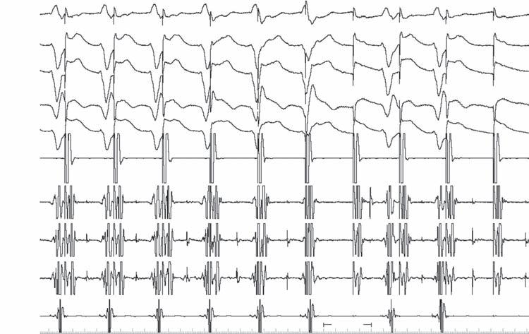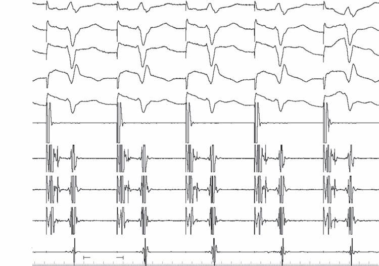 A 56-year-old man experienced syncope while walking at work. Coworkers called emergency medical services (EMS). Upon the arrival of EMS, he was awake and feeling normal but was convinced to go to the emergency room (ER). The patient had a history of anterior wall myocardial infarction (MI), percutaneous coronary intervention (PCI), to left anterior descending coronary artery (LAD) several years before, and a negative stress test within the last 6 months. Examination results were normal except for obesity. ECG showed sinus rhythm, long PR, right bundle branch block (RBBB), left anterior fascicular block (LAFB), and anterior scar. Echocardiogram revealed ejection fraction (EF) 40% and anterior hypokinesis. The patient was referred for electrophysiology (EP) study.