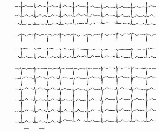 The ECG in Fig. 1-1 shows sinus rhythm with a prolonged P wave (left atrial abnormality), slightly prolonged PR interval, RBBB and left anterior fascicular block, and an extensive anterior infarction. On the basis of this, there are many possible causes of syncope—atrial arrhythmias (atrial flutter and fibrillation, other reentrant atrial tachycardias), heart block (either in AV node or His-Purkinje system), or ventricular arrhythmia (ventricular tachycardia or fibrillation). There is nothing in the ECG to favor one cause of syncope over another, and because treatment strategies are very different depending on the cause (medications or ablation for atrial arrhythmias; pacemaker for heart block; implantable defibrillator for ventricular arrhythmias), further investigation is needed.
