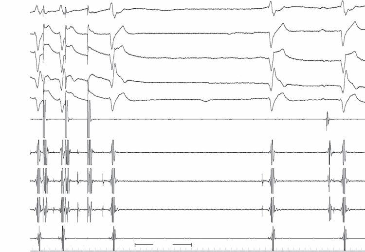 and the HV intervals on the prior two cycles had prolonged (thus, infra-His Wenckebach). This is distinctly abnormal and likely warrants pacemaker implantation. However, this may not be the reason that syncope had occurred (there may be other abnormalities that have not yet been uncovered during the study). Atrial Pacing