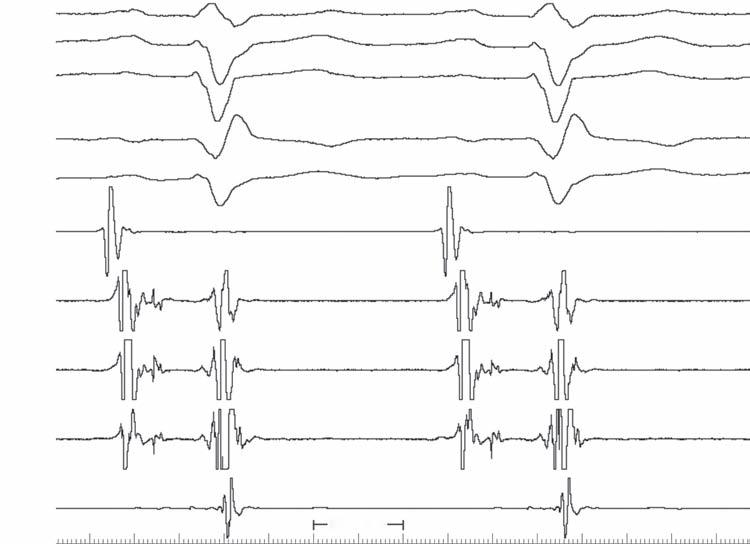 Fig. 2-2 shows normal intracardiac intervals (AH, HV); there is no evidence of preexcitation on intracardiac recordings. Normal progression of atrial activation is seen from right atrium to His to coronary sinus proximal to distal.