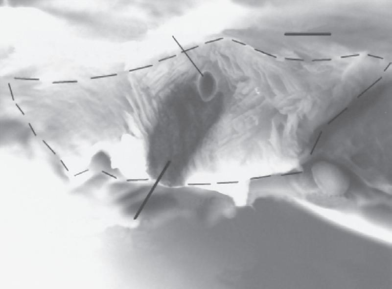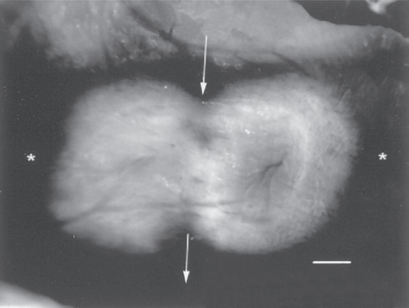 Fig. 1.11 Top, Epicardial view of two radiofrequency lesions created during perfusion of a penetrating marginal artery in a rabbit heart. The lesions show central pallor that is apparent after vital staining. The course of the artery is marked. The asterisks mark the line used for perpendicular sectioning of the lesion. Bottom, Cross-section through the middle of lesion perpendicular to marginal artery. The broken lines outline the lesion boundary. A region of myocardial sparing contiguous to the penetrating marginal artery (labeled) is apparent. Electrical conduction was present across this bridge of viable myocardium postablation. (From Fuller IA, Wood MA. Intramural coronary vasculature prevents transmural radiofrequency lesion formation: implications for linear ablation. Circulation. 2003;107:1797-1803. With permission.)
