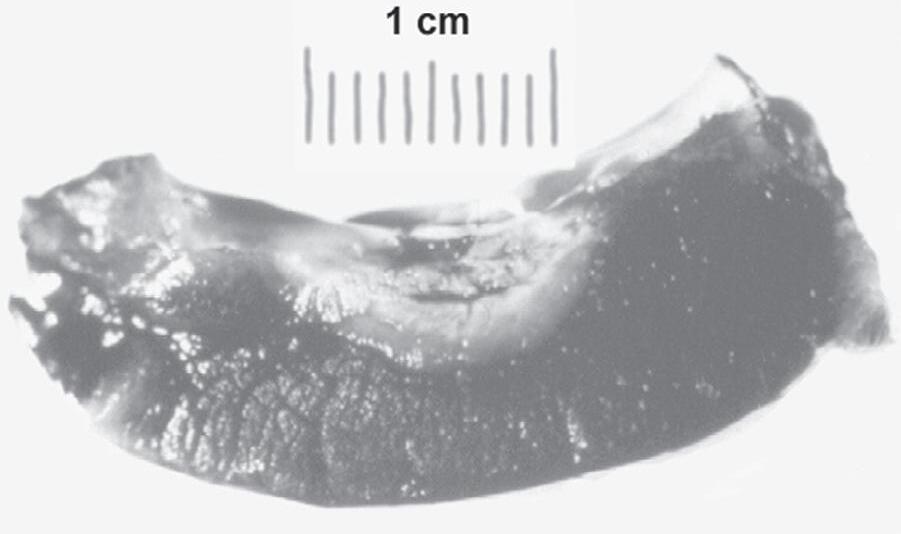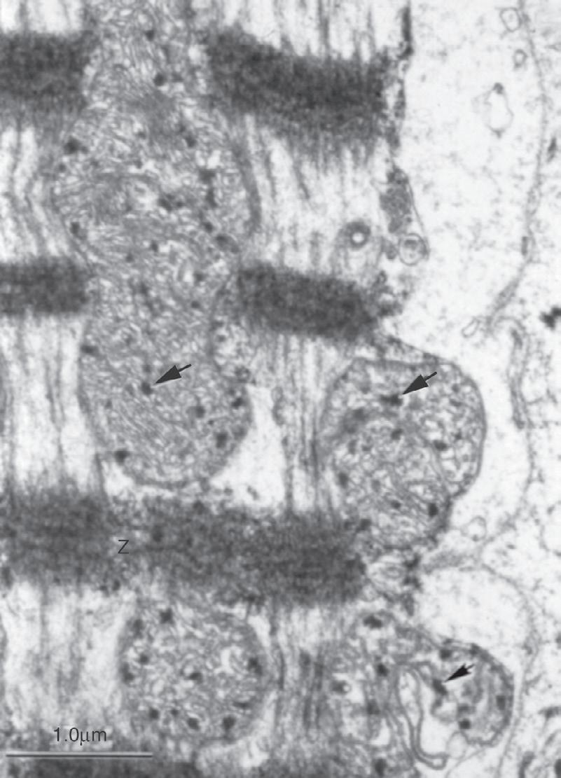 and discontinuous cristae membranes. The sarcomeres were extended with loss of myofilament structure or were severely contracted. The T tubules and sarcoplasmic reticulum were either absent or severely disrupted. Gap junctions were also either severely distorted or absent. Thus despite the fact that the tissue examined was outside of the border of the acute pathologic lesion, the changes were profound enough to conclude that some progression of necrosis would occur within this border zone. The band of tissue 3 to 6 mm from the edge of the pathologic lesion was examined, and it showed significant ultrastructural abnormalities, but not as severe as those described closer to the lesion core. Severe abnormalities of the plasma membrane were still present, but gap junctions and mitochondria were mainly intact. The sarcomeres were variable in appearance, with some being relatively normal and some partially contracted. Although ultrastructural disarray was observed in the 3- to 6-mm zone, the myocytes appeared to be viable and would likely recover from the injury.70