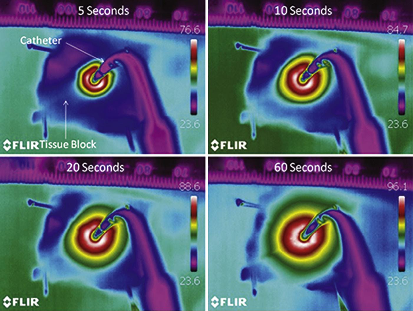Electrode materials with high heat-transfer characteristics (such as gold and diamond) are more effectively cooled by passive blood flow and may allow for greater energy deliveries.30,31