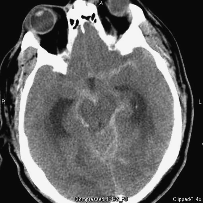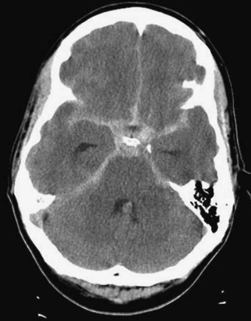 A noncontrast computed tomography (CT) scan of the head was obtained in the emergency department (Figure 2.1). A subsequent CT angiography (CTA) scan was interpreted as negative for vascular abnormality, and a consultation with a neurosurgeon was obtained.