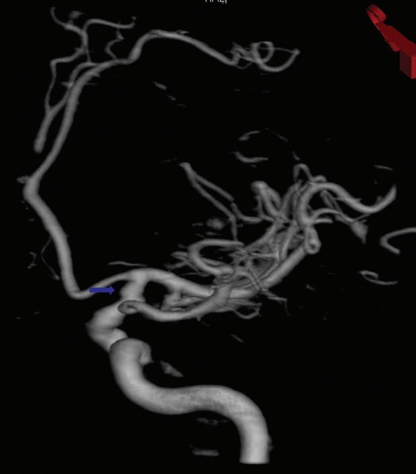 Figure 2.2 Three-dimensional rotational angiogram of the right internal carotid artery demonstrates a small, sessile, raised area (arrow) on the dorsal surface of the distal supraclinoid carotid artery.