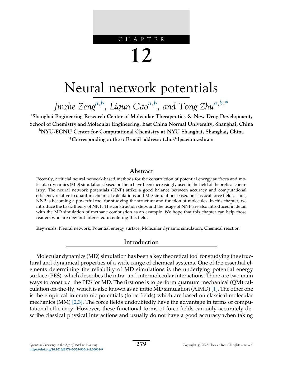Recently,wehaveusedtheneuralnetwork-basedpotentials(NNP)tosimulateanumber oftypicalchemicalsystems,suchasthehydrationofzincions [52],metalloproteins [53],and combustionreactions [54,55] (Fig.1).Metals,especiallysometransitionmetals,areimportant cofactorsintheregulationofproteinstructureandfunction.However,importantquantum effectsassociatedwithmetalcoordinationareoftennotaccuratelydescribedbyclassicalforce fields.Wefoundthatbenefittingfromitspowerfulfittingability,theNNPcaneasilyachieve higheraccuracythanclassicalforcefieldsinthesesystems.Combustionisanevenmorecomplexchemicalsystemthatinvolvesthousandsofchemicalreactionsandgenerateshundreds ofmolecularspeciesduringtheprocess.Traditionally,MDsimulationsbasedonreactive forcefieldssuchasReaxFF [56] wereusedtoinvestigatethecombustionreactionprocesses. However,theaccuracyoftheReaxFFhasoftenbeencriticized [57,58].Wehavedeveloped NNPsasaccurateasDFTmethodtoachieveefficientsimulationsofmethanecombustion andlong-chainalkanepyrolysis.FromtheMDtrajectories,onecannotonlyobtaindetailed reactionnetworksbutalsodiscovernewreactions.Withthischapter,wehopetopassonour experiencetohelpmorebeginnersbetterunderstandanduseNNPandtheMDsimulations basedonit.
