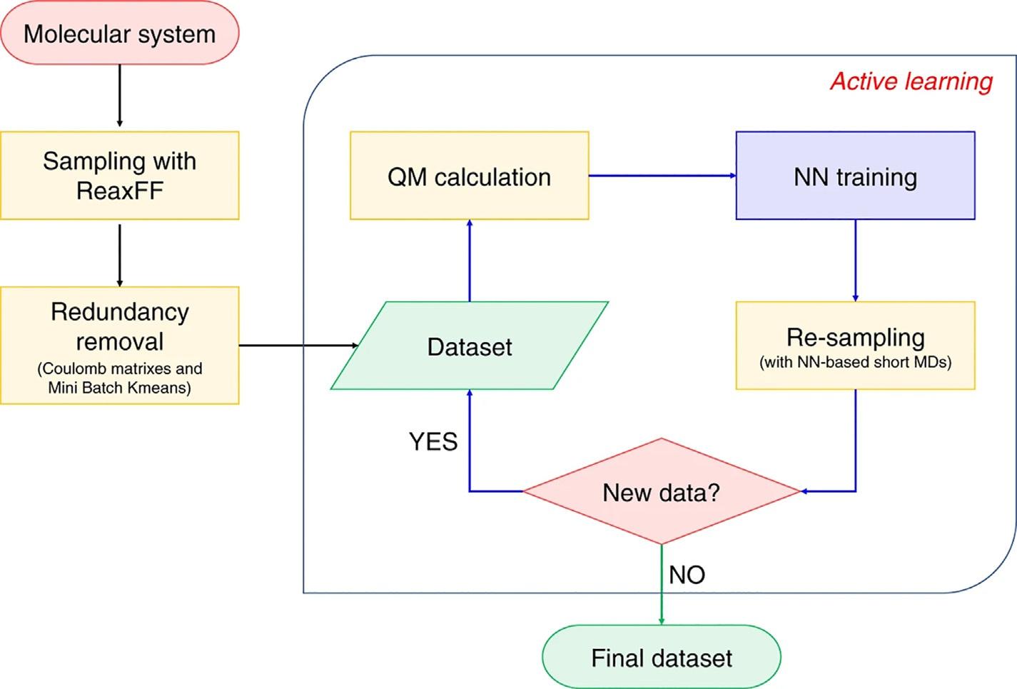 Firstly,weneedtoprepareaninitialdatasetbyusingashortMDsimulationwiththe ReaxFFforcefield.Foreachatomineachsnapshotofthetrajectory,webuiltamolecularclusterwhichcontainsthisatomandspeciesthatwithinaspecifiedcut-offcenteredonit.Thenthe MiniBatchKMeans [77] isusedtoremovetheredundancy.Startingfromtheinitialdataset, fourdifferentNNPmodelsweretrainedbasedonthedatasetfromthelaststep.Thenseveral shortMDsimulationswereperformedbasedononeoftheseNNPmodels.Duringthesimulation,theatomicforcesofthecentralatominthemolecularclusterareevaluatedbyallfour NNPmodelssimultaneously.Foraspecificatom,ifthepredictedforcesbythesefourmodels