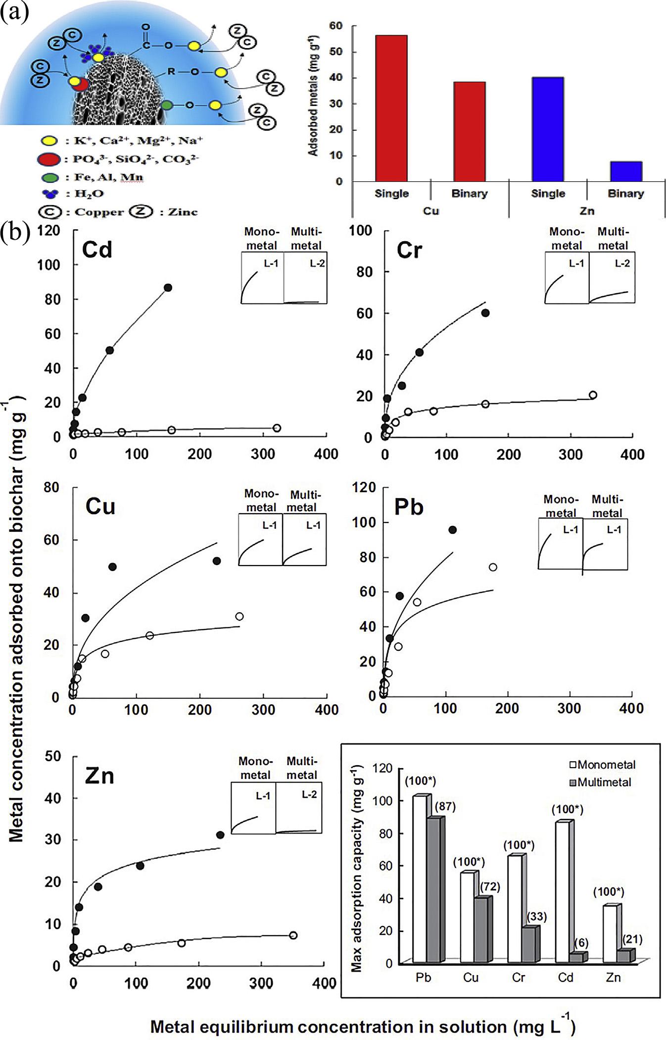 FIGURE6.15 (A)Adsorptionmechanismofricestrawbiocharandsingle-andbinary-metaladsorptionisothermsforCuand Znbyricestrawbiochar[152];(B)Monometalandmultimetaladsorptionisothermsforthe fivemetals(Cd,Cr,Cu,PbandZn)by sesamestrawinthebatchexperiment.(C)Monometaladsorptionisotherm,(B)Multimetaladsorptionisotherm. Squarebox: Comparisonofthemaximumadsorptioncapacityoftheheavymetalsinmonometalandmultimetaladsorptionisotherms[153].