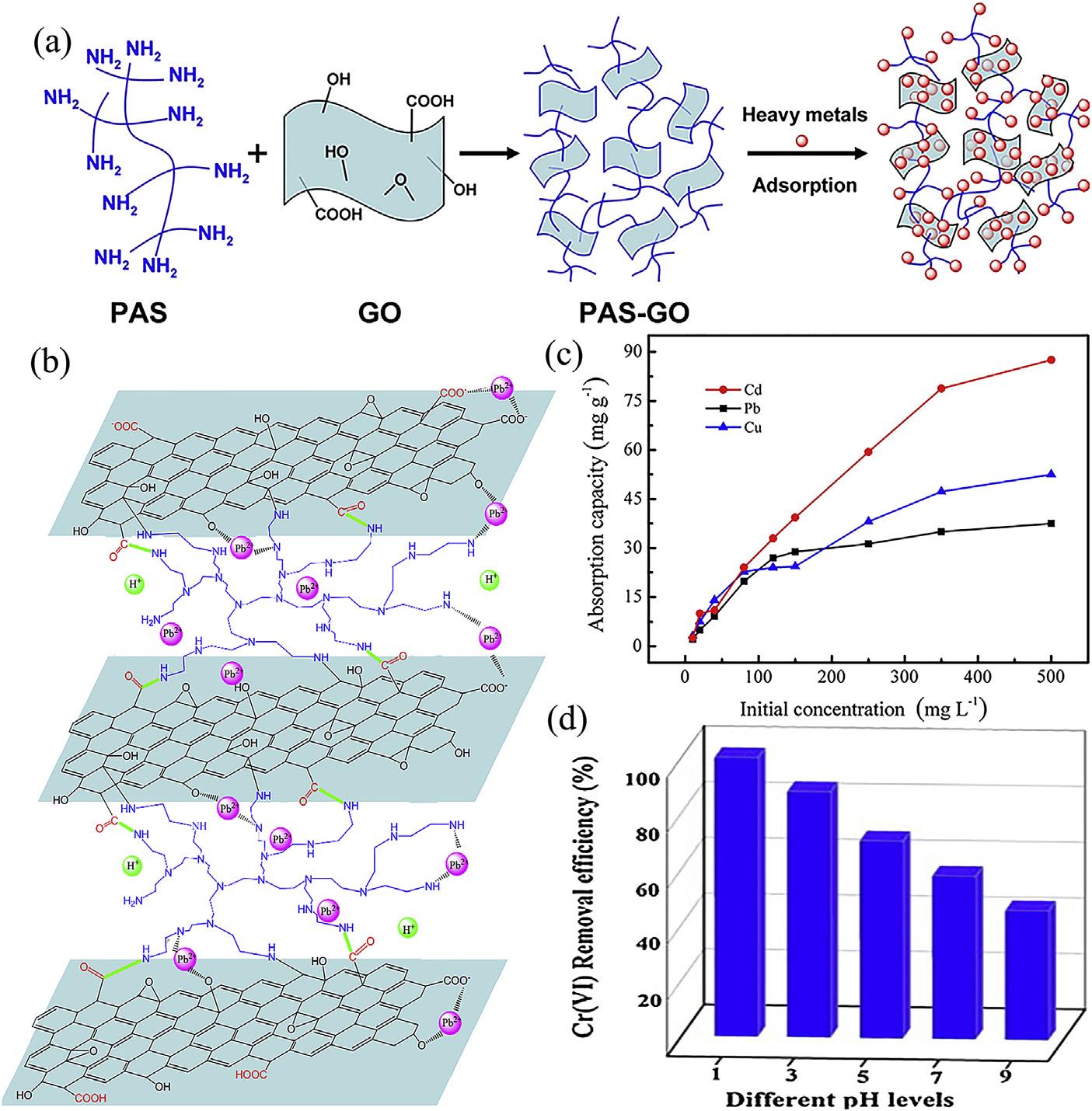 Dindaetal.[182]synthesizedsulfuricaciddoped diaminopyridinepolymersinsituonGOsurface (G-PDAP)viamutualoxidation-reductiontechnique.Itshowsveryhighadsorptioncapacity (609.76mg$g 1)duringremovalprocess.The compositetakesonly100mintoremovethe highconcentrationof500mg L 1 Cr(VI)from water.Interestingfeaturesforthismaterialare theenhancementofremovalefficiencyatlower acidicconditionduetotheformationofacid