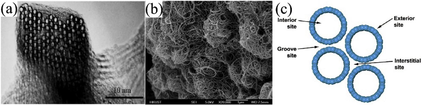 FIGURE6.10 ElectronicmicroscopeimagesofdifferentCNTs:(A)TEMimageofSWCNTbundle;(B)SEMimageof entangledMWCNTagglomerates[127];(C)Fourtypesofadsorptionsitesofcarbonnanotubes[128].