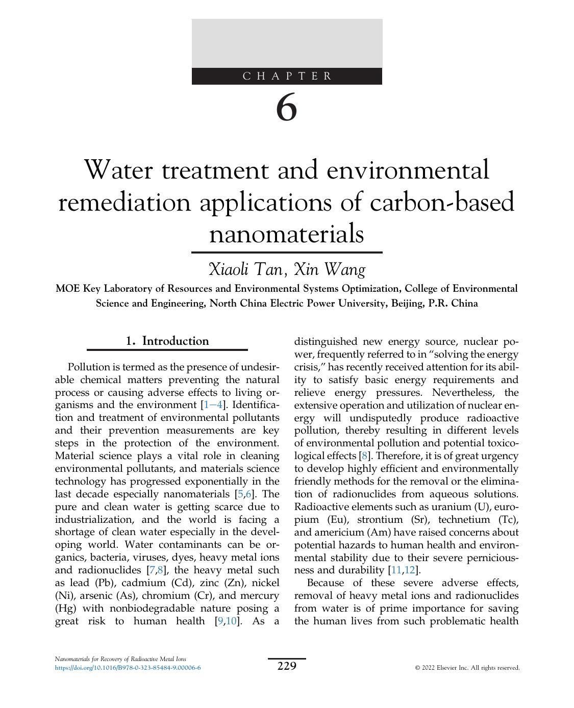 issues.Toxicmetalionscouldberemovedby numerousmethods,likeionexchange,reverse osmosis,precipitation filtration,biosorption, coagulation,andextraction[13 15].Adsorption isconsideredthebestmethodasitiscosteffective,highlyefficient,andeasytooperate forremovingtracelevelsofheavymetalions orradionuclides.Avarietyofmaterialshave beentestedasadsorbentsforwatercontaminationremediation.Commonlyusednanomaterialsforadsorptionofpollutantsaremetal oxides(Fe3O4,CuO,TiO2,etc.)[16,17],transition metalchalcogenides(NiS/Ni3S4,MoS2,ZnS, ZnSe,etc.)[18 21],transitionmetalcarbides andcarbonitrides(MXenes)[22],layereddouble hydroxides(LDHs)[23],magneticnanomaterials [24],polymernanocomposites[25]andcarbon nanomaterials,etc.[26].However,inthescientificcommunity,carbon-basednanomaterialsare gainingpopularityasnanosorbentsforwater treatmentduetotheirsizeandshapedependent properties,environmentallybenignnature,abundance,andeaseofhandling[17,27].Inthischapter,wewilltrytoreviewthelatestadvancement intheapplicationofcarbonnanomaterials, namelyactivatedcarbons(ACs),carbonnanotubes(CNTs),graphene,anditsderivatives includinggrapheneoxide(GO)andcarbonnanofibers(CNFs)inthepurificationofheavymetal andradionuclidesinion-contaminatedwater.