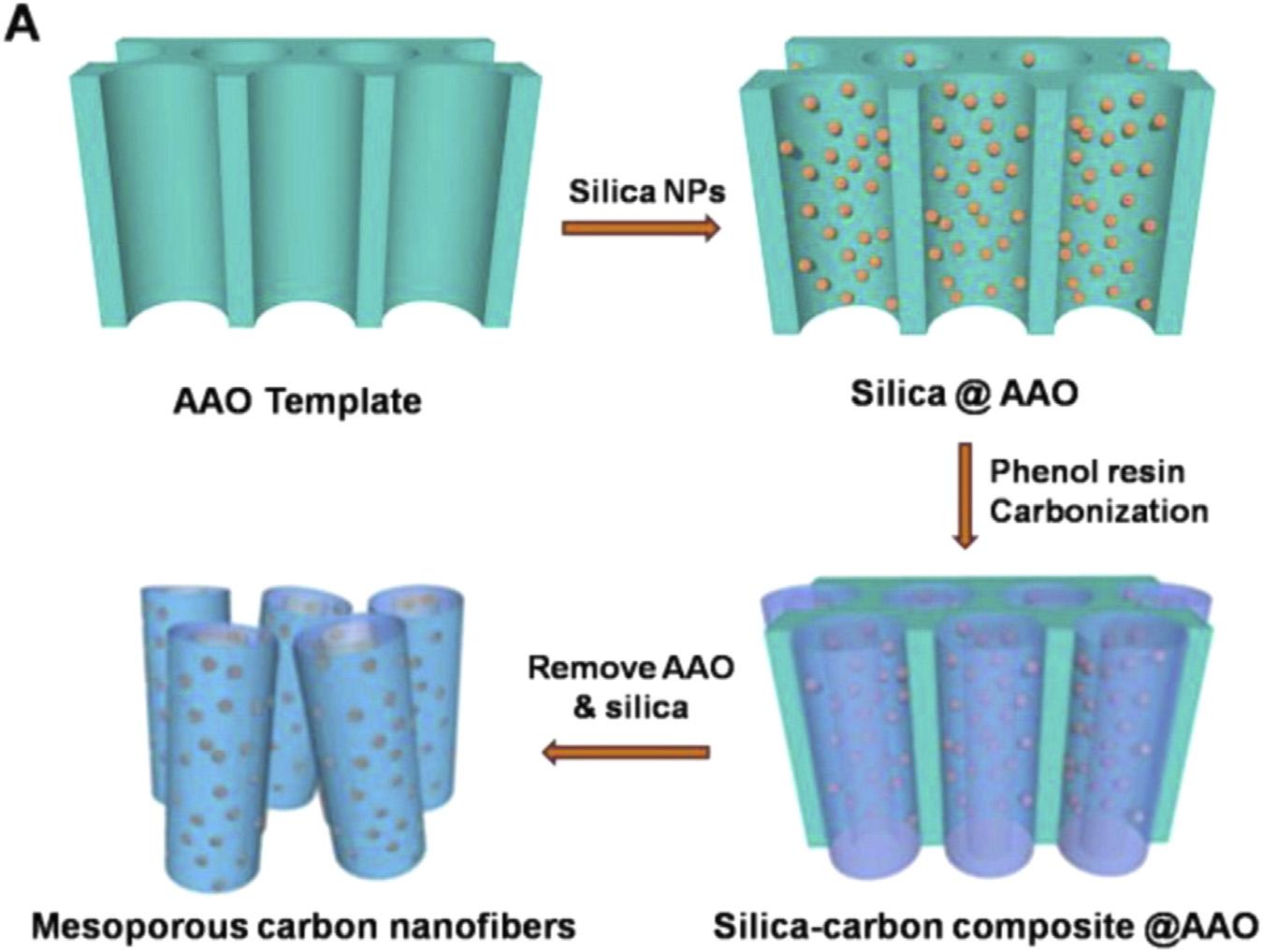 InadditiontoelectrospinningandCVDsynthesis,templatedsynthesiswithporoussubstratesandnanowiresprovidesalternative waysfortheproductionofCNFs.Forinstance, Xingetal.[138]demonstratedthetemplated synthesisofCNFsbyusinganodicaluminum oxide(AAO)membranesandcommercially availablecolloidalsilicananoparticles(SiNPs) ascotemplatesandphenolresinasacarbon source.Asindicatedin Fig.6.13,SiNPswere firstlyincorporatedintotheinnerwallofAAO membranetoformSi@AAO,andthenphenol resinwasaddedintothedualtemplatedfor carbonizationat973KunderN2 gas flowto