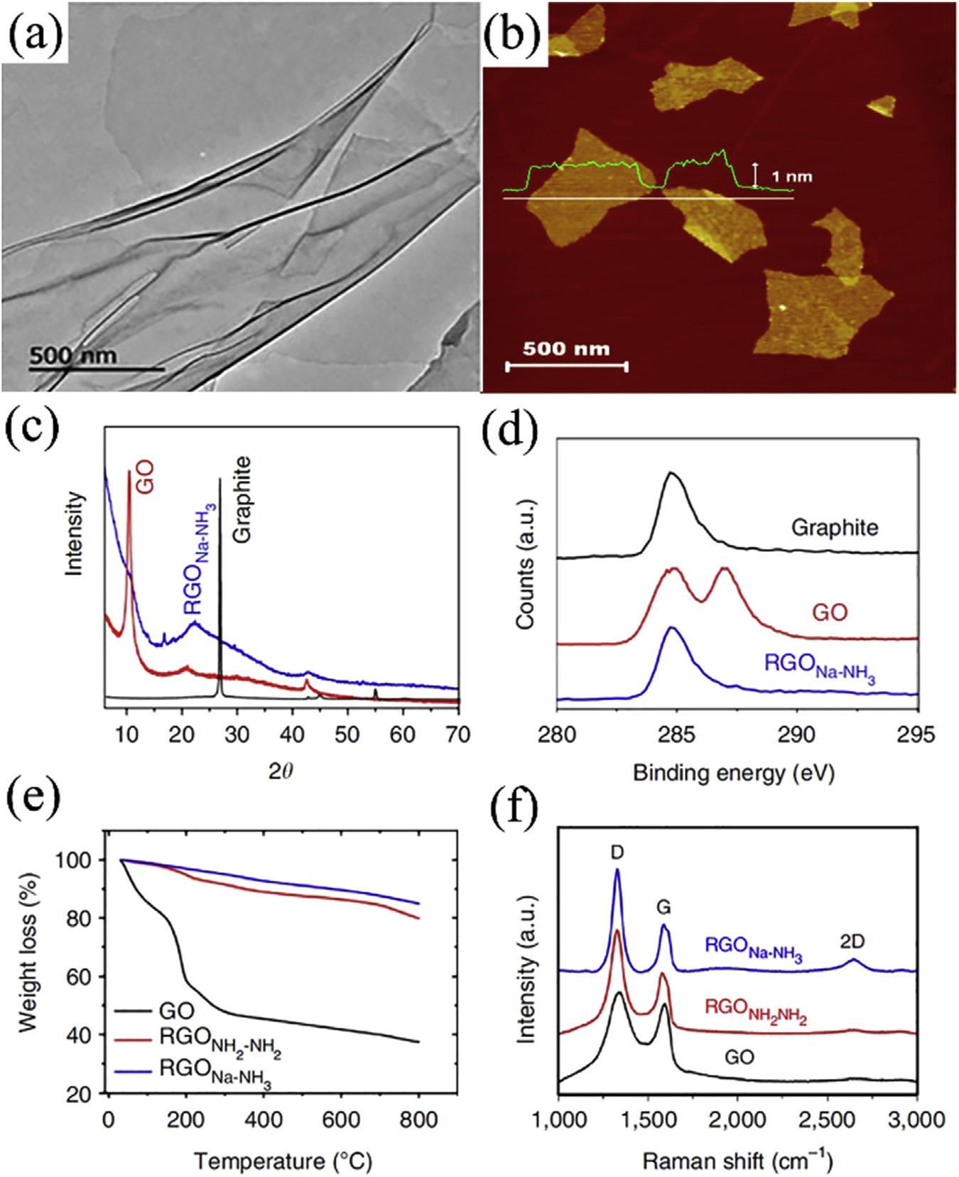 FIGURE6.6 (A)TEMimageofGO[99];(B)hydrazine-reducedgrapheneoxidesheets[100];(C)X-raydiffraction(XRD) patternsofgraphite,GOandRGOpowder;(D)XPSspectraofgraphite,GOandRGO;(E)TGAthermogramsforGOand RGO;(F)RamanspectraofGO,RGONH2 NH2 andRGONa NH3 powder[101].
