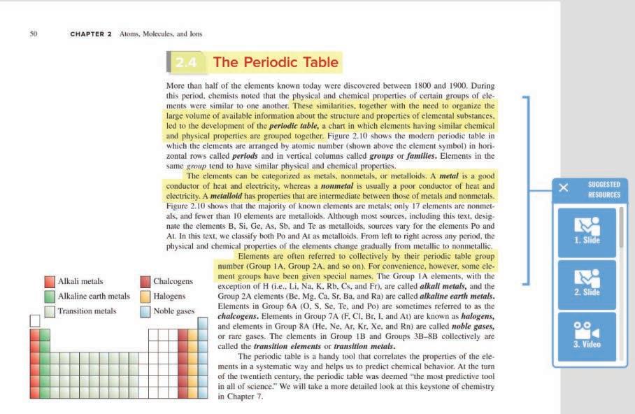 Our revision for the eighth edition focused on continued optimization of the text. To aid us in this process, we were able to use data from literally thousands of student responses to questions in LearnSmart, the adaptive learning system that assesses student knowledge of course content. The data, such as average time spent answering each question and the percentage of students who correctly answered the question on the first attempt, revealed the learning objectives that students found particularly difficult. We utilized several approaches to present these difficult concepts in a clearer, more straightforward way in the eighth edition of Chemistry: The Molecular Nature of Matter and Change. Making the concepts clearer through digital learning resources. Students will be able to access over 2,000 digital learning resources throughout this text’s SmartBook. These learning resources present summaries of concepts and worked examples, including over 400 videos of chemistry instructors solving problems or modeling concepts that students can view over and over again. Thus, students can have an “office hour” moment at any time.