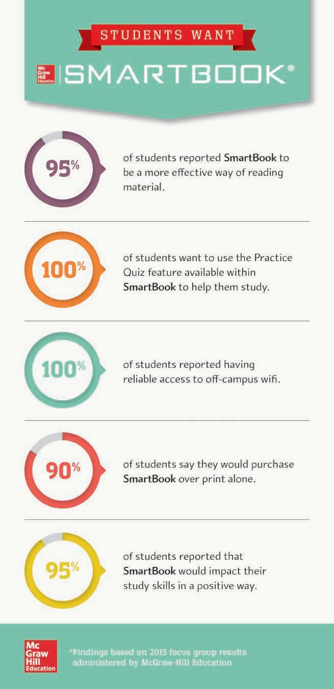 Proven to help students improve grades and study more efficiently, SmartBook contains the same content within the print book, but actively tailors that content to the needs of the individual. SmartBook’s adaptive technology provides precise, personalized instruction on what the student should do next, guiding the student to master and remember key concepts, targeting gaps in knowledge and offering customized feedback, and driving the student toward comprehension and retention of the subject matter. Available on tablets, SmartBook puts learning at the student’s fingertips—anywhere, anytime.