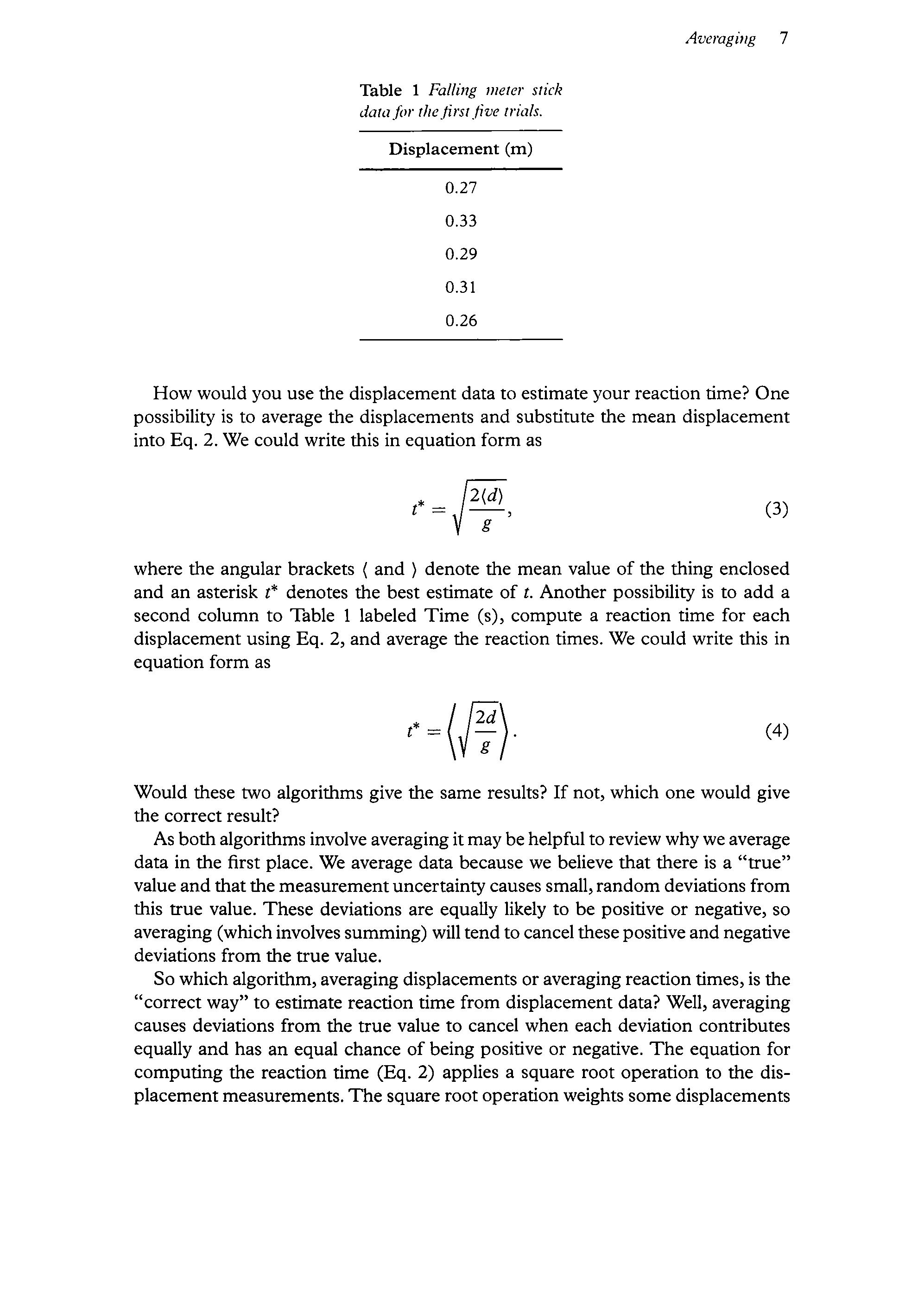 where the angular brackets ( and ) denote the mean value of the thing enclosed and an asterisk ¢* denotes the best estimate of t. Another possibility is to add a second column to Table 1 labeled Time (s), compute a reaction time for each displacement using Eq. 2, and average the reaction times. We could write this in equation form as