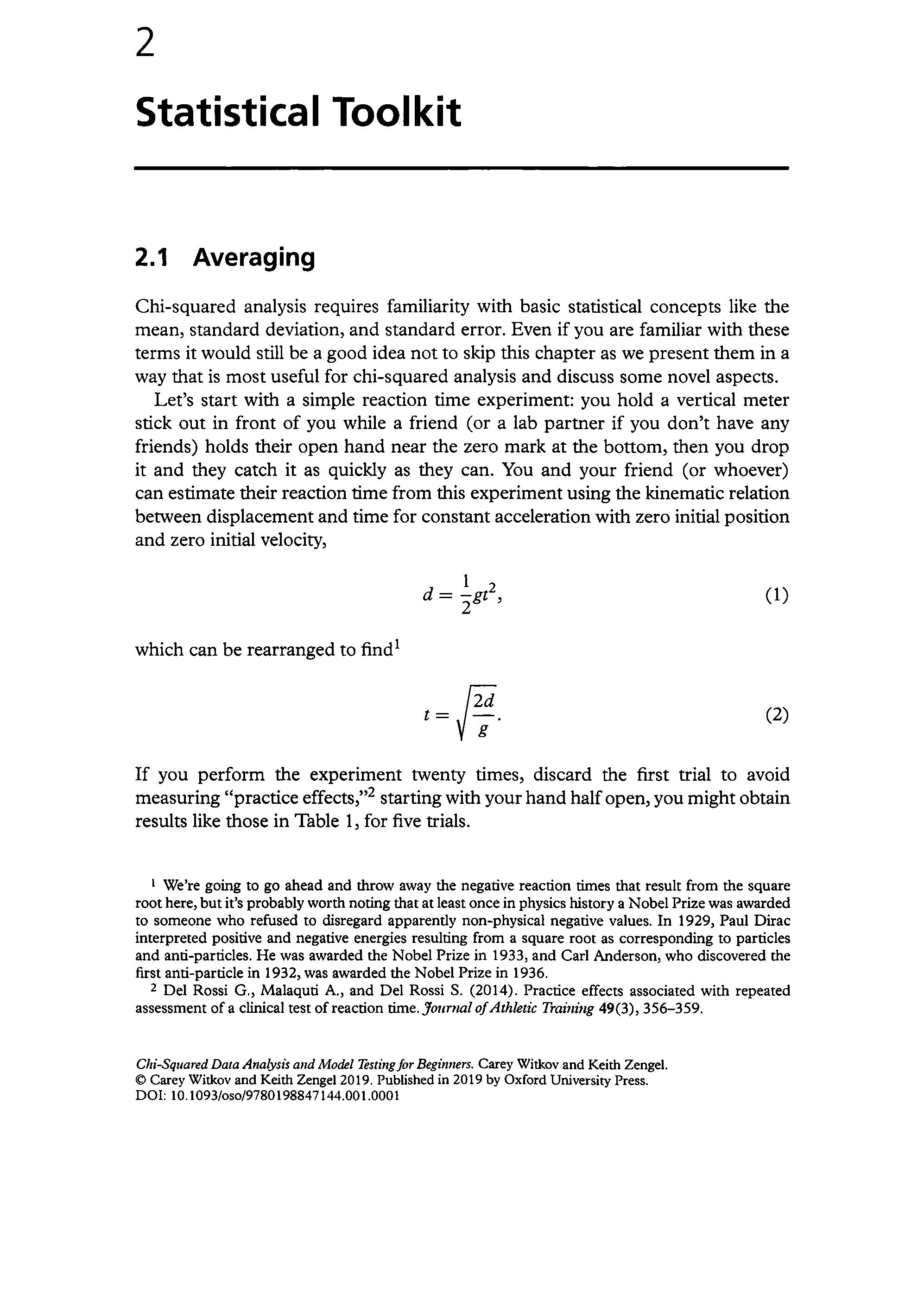 Chi-squared analysis requires familiarity with basic statistical concepts like the mean, standard deviation, and standard error. Even if you are familiar with these termsit would still be a good idea not to skip this chapter as we present them in a way that is most useful for chi-squared analysis and discuss some novelaspects. Let s start with a simple reaction time experiment: you hold a vertical meter stick out in front of you while a friend (or a lab partner if you don t have any friends) holds their open hand near the zero mark at the bottom, then you drop it and they catch it as quickly as they can. You and your friend (or whoever) can estimate their reaction time from this experiment using the kinematic relation between displacementand time for constant acceleration with zeroinitial position and zeroinitial velocity,