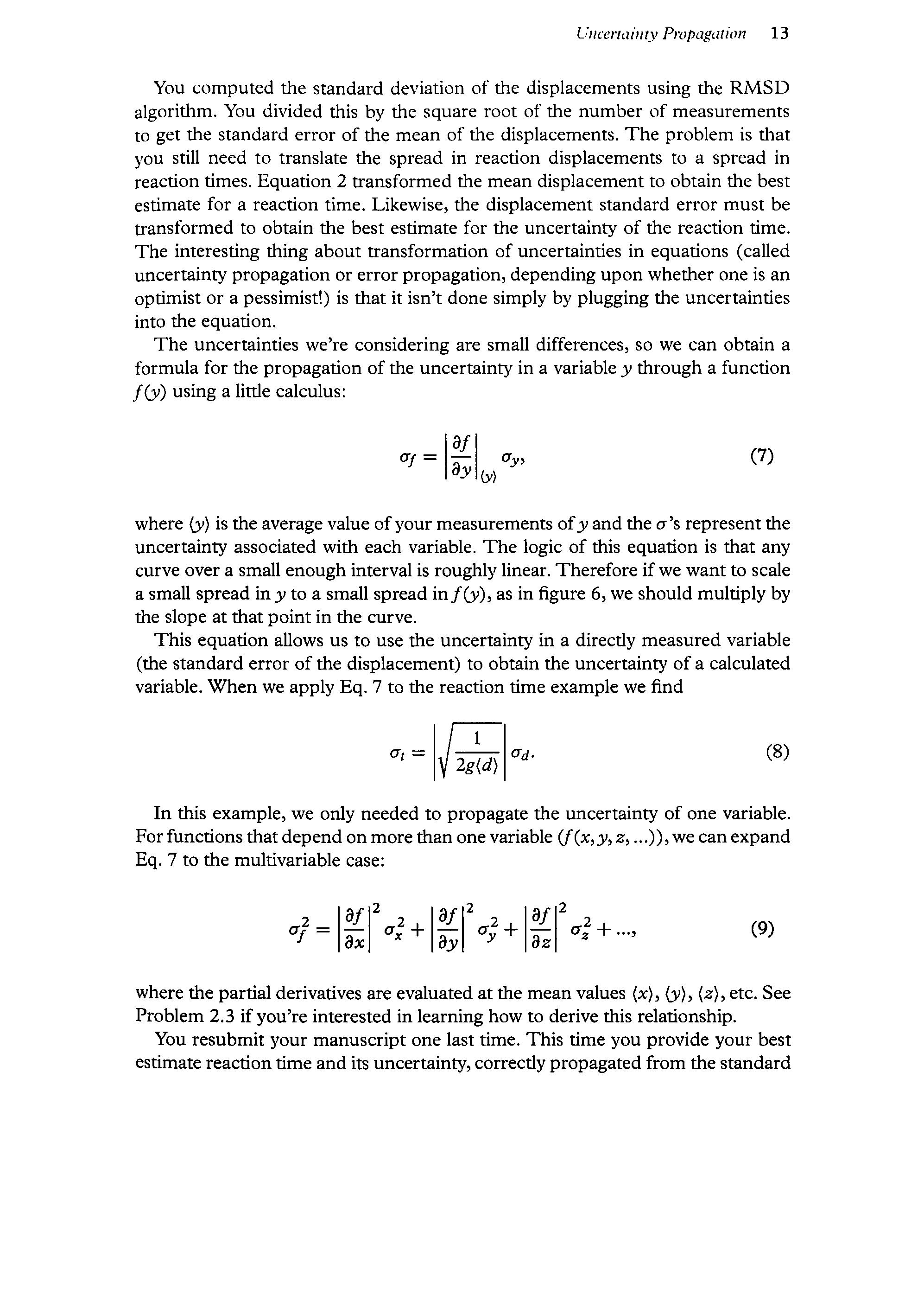 This equation allows us to use the uncertainty in a directly measured variable (the standard error of the displacement) to obtain the uncertainty ofa calculated variable. When we apply Eq. 7 to the reaction time example wefind