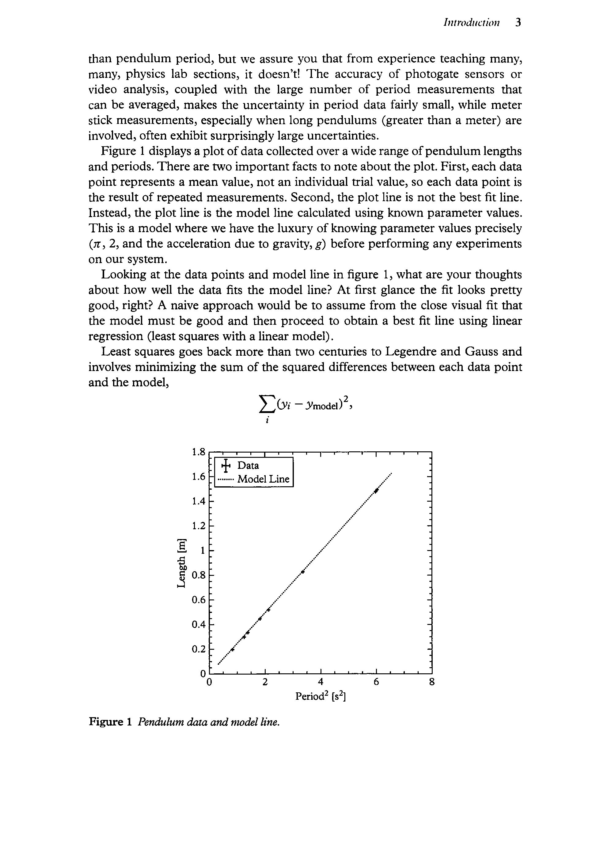 Figure 1 displays a plot ofdata collected over a wide range ofpendulum lengths and periods. There are two importantfacts to note aboutthe plot. First, each data point represents a mean value, not an individualtrial value, so each data pointis the result of repeated measurements. Second,the plot line is not the best fit line. Instead, the plot line is the model line calculated using known parameter values. This is a model where we havethe luxury ofknowing parametervaluesprecisely (2, 2, and the acceleration due to gravity, g) before performing any experiments on our system.