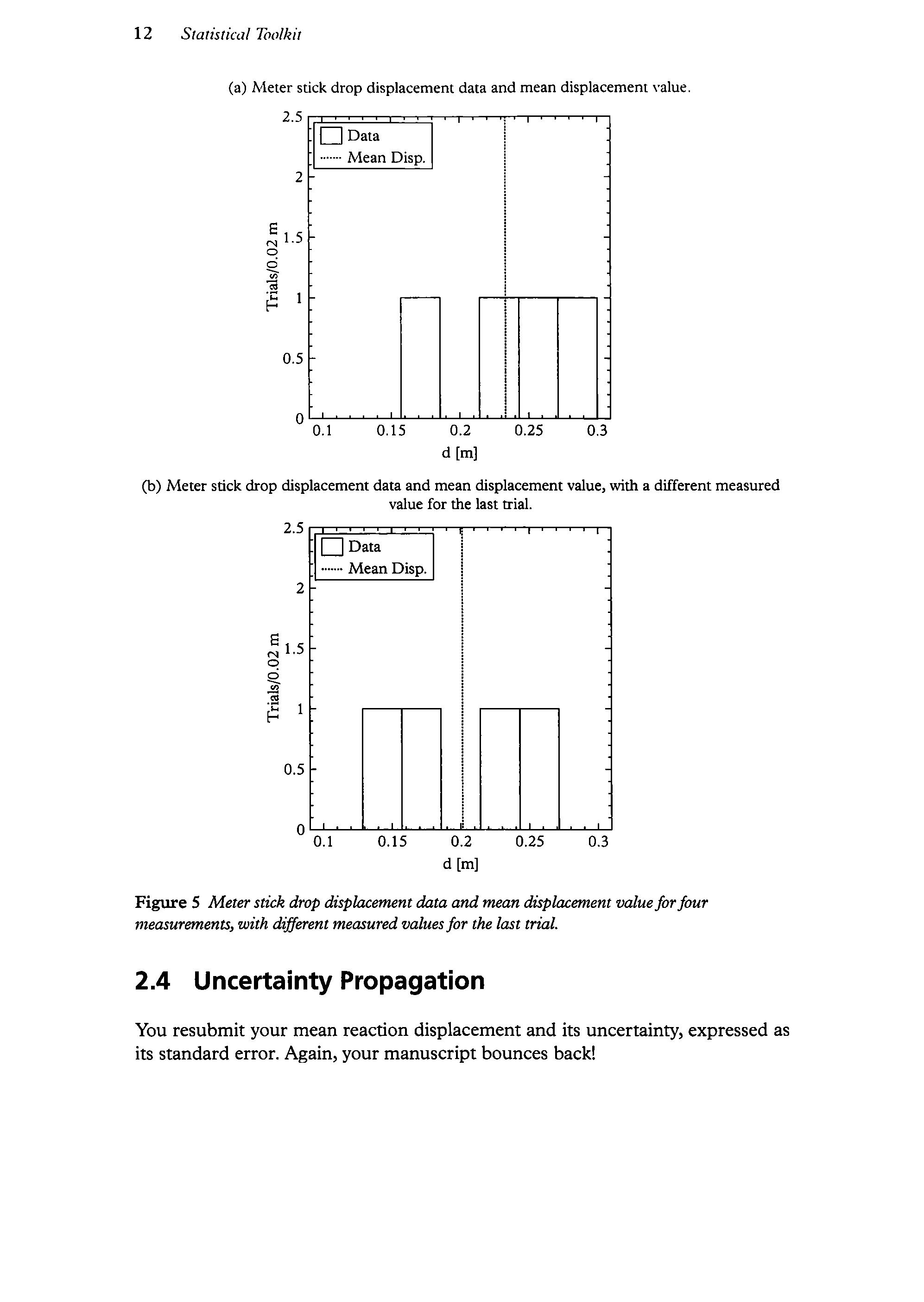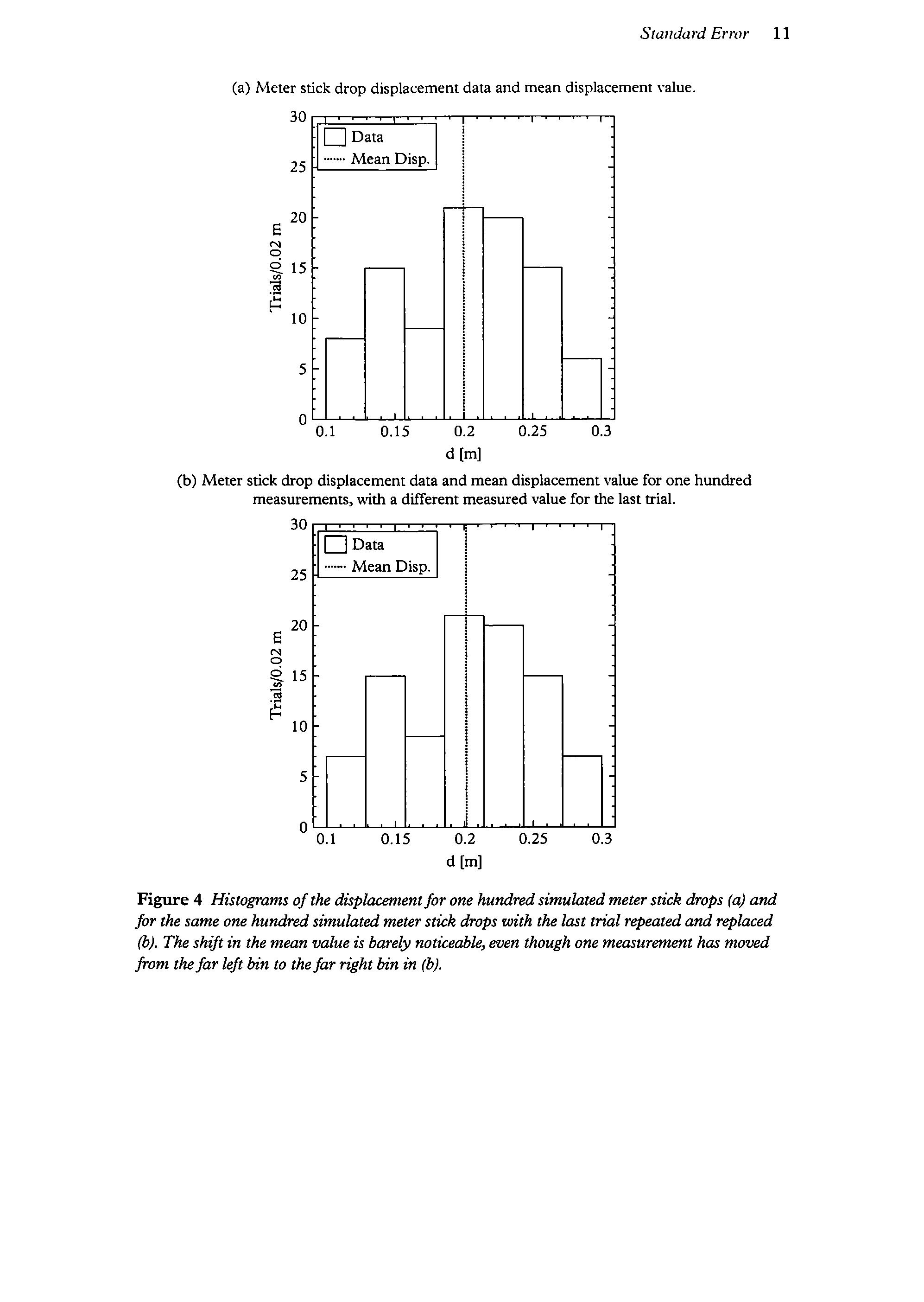 Now consider the hypothetical case oftaking only four measurements, finding the mean and standard deviation, and then repeating and replacing one ofthose measurements. See figure 5 for an example ofdata from four measurements,with and withoutthe last trial repeated and replaced. You would still find it perfectly natural if the new measurement were one standard deviation from the mean of your original four measurements, but you also wouldn t be so surprised or find much reason for concern for your health if your new mean value shifted by a considerable amount. In other words, the uncertainty ofyour next measurement (the standard deviation) won t changeall that much as you take more data, but the uncertainty on the mean of your data should get smaller as you take more data. This is the same logic we used previously to explain why we averaged the displacementdata: every measurement includes some fluctuation around the true value, which cancels out when we take the average. We don t expect these experimental uncertainties to be magically resolved before the nexttrial,but as we take more data, the mean valueis less susceptible to being significantly shifted by the fluctuation in any one particular measurement.