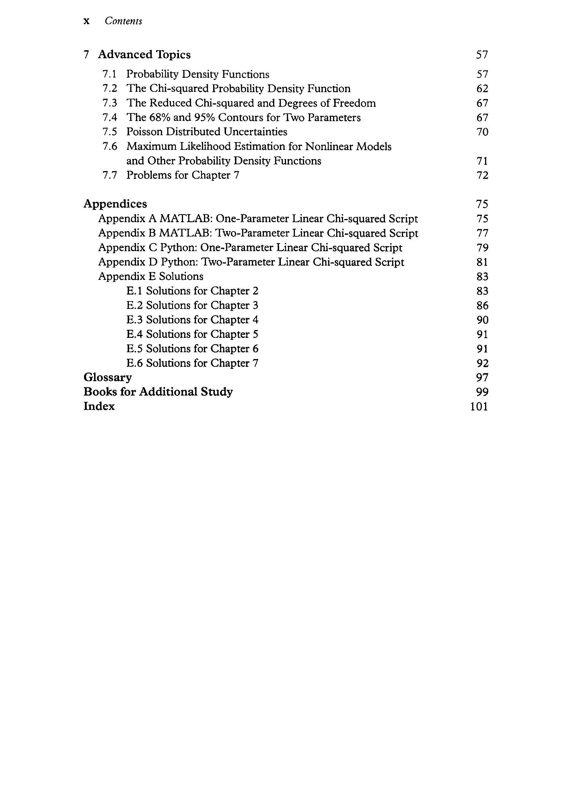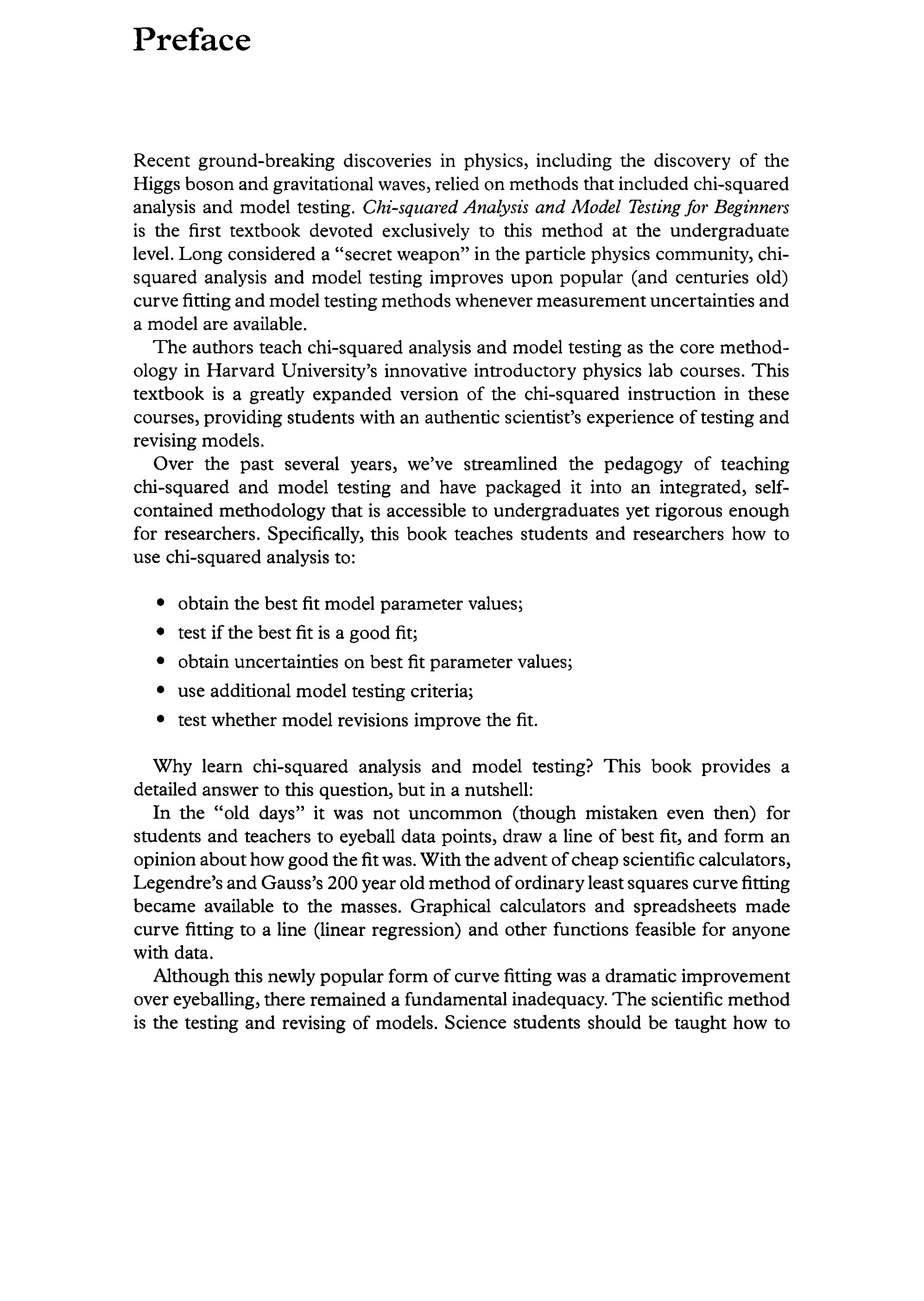 CW: I thought I understood chi-squared analysis and model testing until I met Keith Zengel. Keith s willingness to share his in-depth understanding of the technicalities of chi-squared analysis and model testing over the past three years we ve taught together is greatly appreciated and gratefully acknowledged. I'd like to thank my 12-year-old son Benjamin (who decided sometime during the writing ofthis bookthathe doesn twantto be a physicist!) fornotcomplaining (too much) over time lost together while this book was being written.