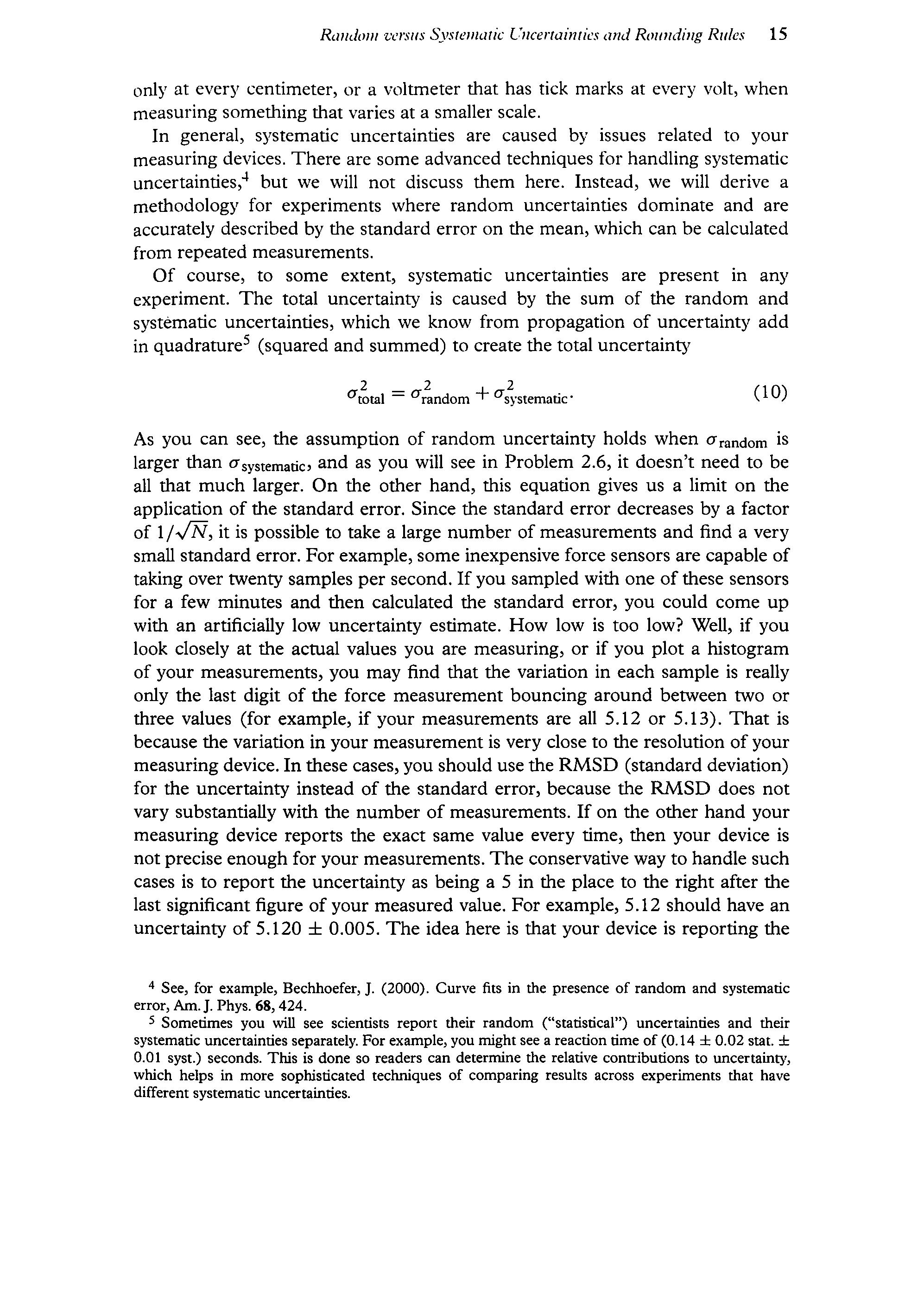As you can see, the assumption of random uncertainty holds when oyandom is larger than O'systematic, and as you will see in Problem 2.6, it doesn t need to be all that much larger. On the other hand, this equation gives us a limit on the application of the standard error. Since the standard error decreases by a factor of 1//N,it is possible to take a large number of measurements and find a very small standard error. For example, some inexpensive force sensors are capable of taking over twenty samples per second. If you sampled with one ofthese sensors for a few minutes and then calculated the standard error, you could come up with an artificially low uncertainty estimate. How low is too low? Well, if you look closely at the actual values you are measuring, or if you plot a histogram of your measurements, you may find that the variation in each sampleis really only the last digit of the force measurement bouncing around between two or three values (for example, if your measurements are all 5.12 or 5.13). That is because the variation in your measurementis very close to the resolution ofyour measuring device. In these cases, you should use the RMSD (standard deviation) for the uncertainty instead of the standard error, because the RMSD does not vary substantially with the number of measurements. If on the other hand your measuring device reports the exact same value every time, then your device is not precise enough for your measurements. The conservative way to handle such cases is to report the uncertainty as being a 5 in the placeto the right after the last significant figure of your measured value. For example, 5.12 should have an uncertainty of 5.120 + 0.005. The idea here is that your device is reporting the
