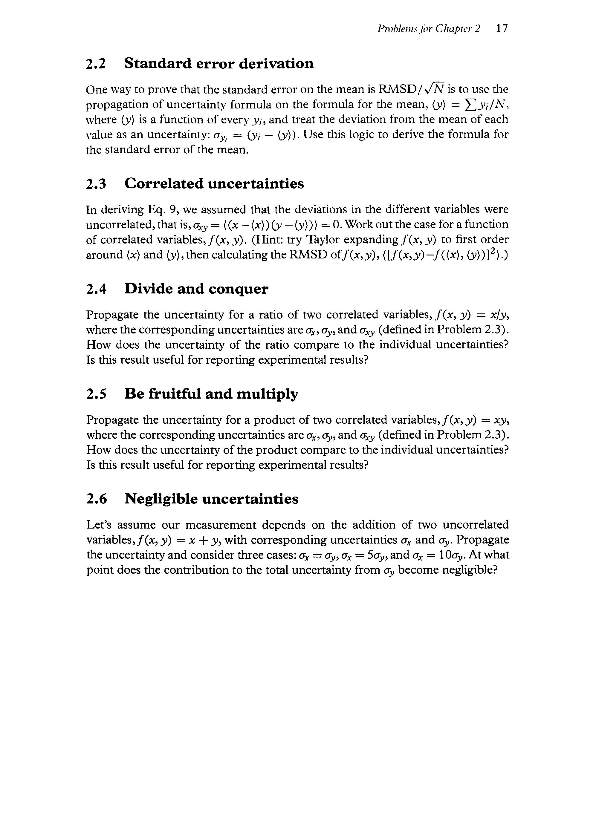 In deriving Eq. 9, we assumed that the deviations in the different variables were uncorrelated,thatis,ay = ((x (x))(vy (y))) = 0.Work outthe case for a function of correlated variables,f(x, y). (Hint: try Taylor expandingf(x, y) to first order around (x) and (y),then calculating the RMSDoff(x,y), (Lf(4.9) f(x), (v))]*).)