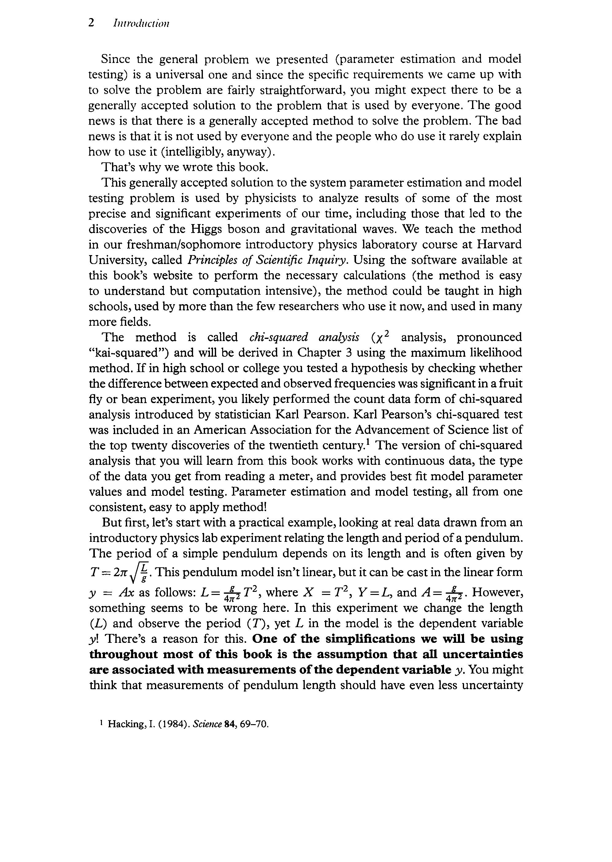 The method is called chi-squared analysis (x? analysis, pronounced kai-squared ) and will be derived in Chapter 3 using the maximum likelihood method.If in high schoolor college you tested a hypothesis by checking whether the differencebetweenexpected and observedfrequencies wassignificantin afruit fly or bean experiment, you likely performed the count data form of chi-squared analysis introduced bystatistician Karl Pearson. Karl Pearson s chi-squared test was included in an American Association for the Advancementof Sciencelist of the top twenty discoveries of the twentieth century.! The version of chi-squared analysis that you will learn from this book works with continuous data, the type of the data you get from reading a meter, and provides best fit model parameter values and model testing. Parameter estimation and modeltesting,all from one consistent, easy to apply method!