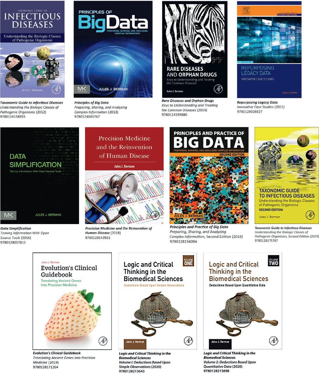 JulesJ.Berman hasreceivedtwobaccalaureatedegrees fromMIT:oneinmathematicsandtheotherinearthand planetarysciences.HeholdsaPhDfromTempleUniversity andanMDfromtheUniversityofMiami.Hecompletedhis postdoctoralstudiesattheUSNationalInstitutesofHealth, andhisresidencyattheGeorgeWashingtonUniversity MedicalCenterinWashington,DC.Dr.Bermanservedas ChiefofAnatomicPathology,SurgicalPathology,andCytopathologyattheVeteransAdministrationMedicalCenterin Baltimore,Maryland,whereheheldjointappointmentsat theUniversityofMarylandMedicalCenterandattheJohns HopkinsMedicalInstitutions.In1998,hemovedtotheUS NationalInstitutesofHealthasMedicalOfficerandastheProgramDirectorfor PathologyInformaticsintheCancerDiagnosisProgramattheNationalCancerInstitute. Dr.BermanisapastpresidentoftheAssociationforPathologyInformaticsandthe2011 recipientoftheAssociation’sLifetimeAchievementAward.Hehasfirst-authoredmore than100journalarticlesandhaswritten20sciencebooks.BookswrittenbyDr.Berman, thatmayinterestreadersof ClassificationMadeRelevant, include